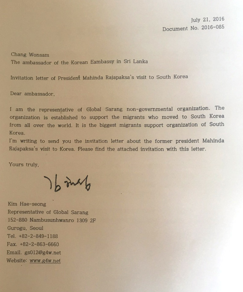 The name of that fundamentalist church that received him in S. Korea was the ’Global Sarang.’ Herein is published the invitation letter sent to Mahinda Rajapakse in proof .
