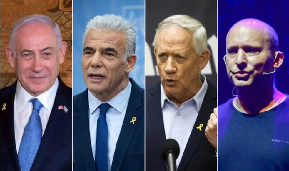 (මෙහි දැක්වෙන ඡායාරූපයේ වමේ සිට දකුණට දක්වා ඇත්තේ, අගමැති බෙන්ජමින් නෙතන්යාහු (පොඩි සාතන්) , විපක්ෂ නායක යායර් ලැපිඩ්, ජාතික එක්සත් පක්ෂයේ ප්රධානී බෙනී ගැන්ට්ස් සහ හිටපු අගමැති නෆ්තාලි බෙනට් ය.)
