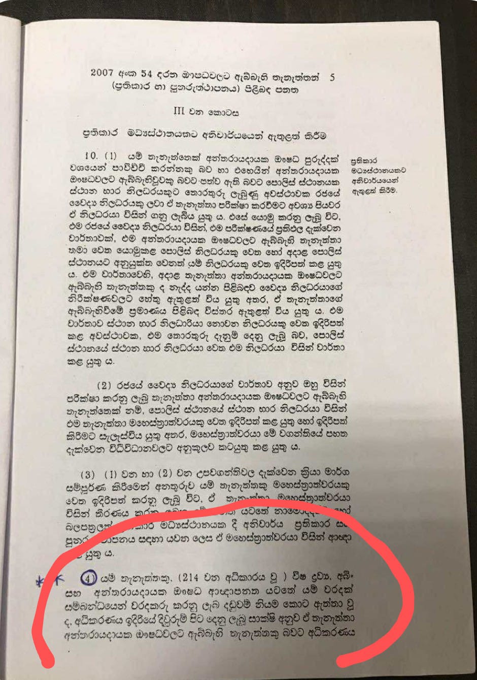 " අනිත් තැන්වල ගිහින් මේක කරන්න බැරි, පුනරුත්ථාපන පනතෙ තියෙනවා ඇබ්බැහි වුණු ප්රමාණය කියලා එකක්. අධිකරණය ඉල්ලනවා ප්රමාණය කෝ කියලා. වෛද්යවරු කියනවා පුමාණයක් දෙන්න විදිහක් නෑ ,දෙන්න පුලුවන් positive ද? Negative ද ? කියලා විතරයි කියලා. Positive නම්, ආයෙ ප්රමාණයක් අහ අහා ඉන්න ඕනෙ නෑ කවුරුවත්, පුනරුත්ථාපනයට යවන්න ඕනෙ. ඉතින් අරගොල්ලො ප්රතික්ෂේප කරනවා."