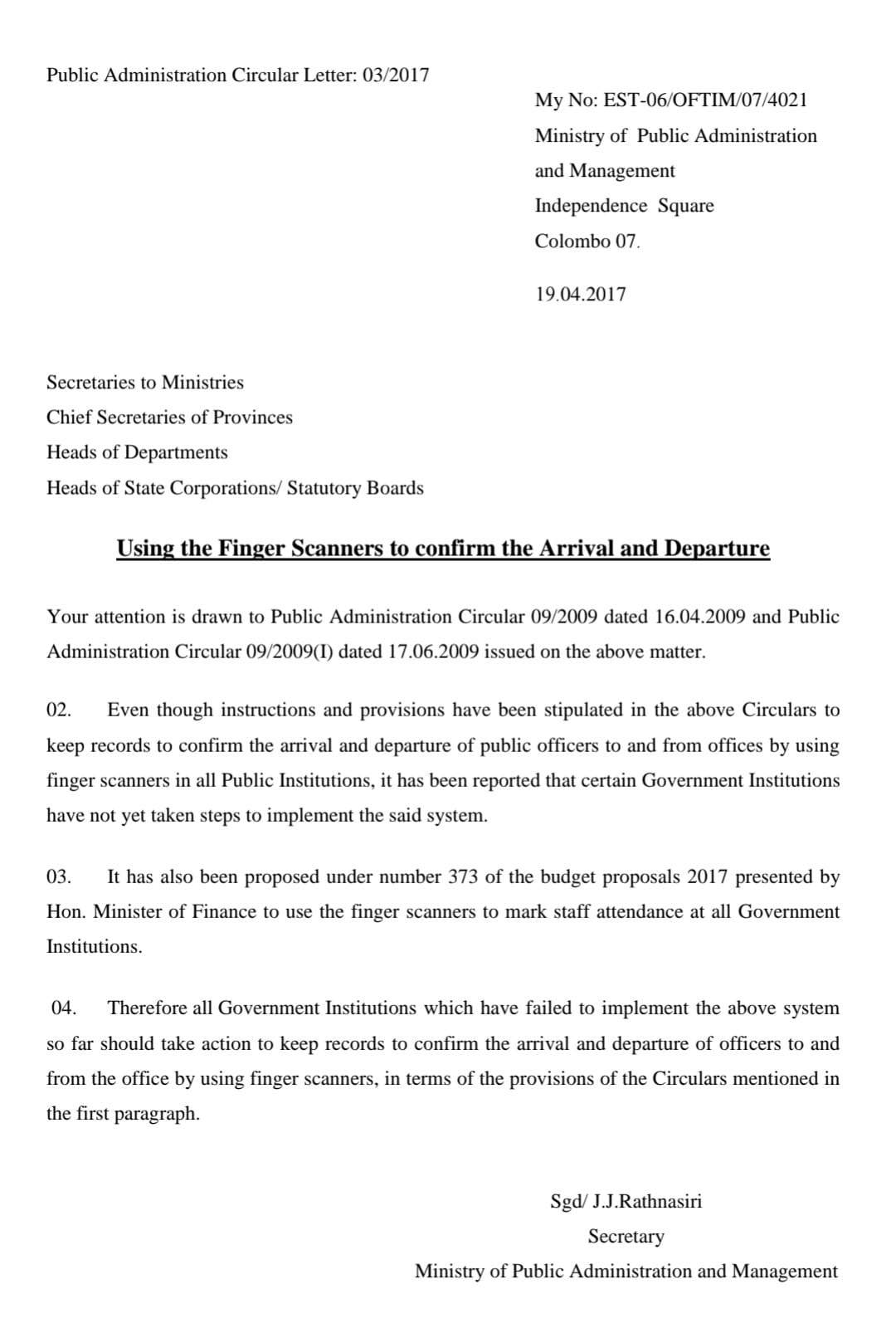 රාජ්ය පරිපාලන චක්රලේඛය 03/2017 (2017 අප්රේල් 19 වන දින Ministry of Public Administration and Management මගින් නිකුත් කරන ලද නිළ ලිපිය ( චක්රලේඛය) මගින් Fingerprint attendance යන්ත්ර භාවිතය සියලු රජයේ ආයතන සඳහා අනිවාර්ය කර ඇත.