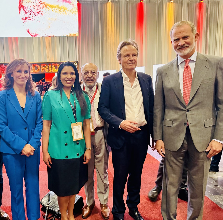 ඡායාරූපය - ස්පාඤ්ඤයේ VI වන ෆෙලිපේ රජු (දකුණු කෙළවරේ) හෘද රෝග විශේෂඥ වෛද්ය යනුෂි දූල්ලෑව විජයරත්න මහත්මිය සමඟ (වමේ සිට දෙවැන්නා). ඡායාරූපයේ (වමේ සිට දකුණට): ස්පාඤ්ඤයේ සෞඛ්ය අමාත්ය වෛද්ය මොනිකා ගාර්ෂියා ගෝමස් මහත්මිය, ලෝක හෘද සම්මේලනයේ සභාපති මහාචාර්ය ජගත් නරුලා මහතා හා යුරෝපීය හෘද රෝග සංගමයේ සභාපති මහාචාර්ය තෝමස් ලුෂර් මහතා.