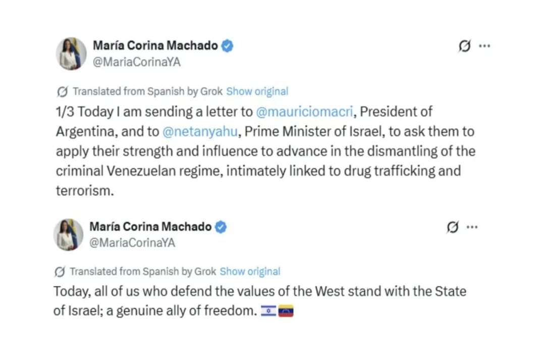 වෙනිසියුලානු විපක්ෂ නායිකා මාරියා කොරිනා මචාඩෝට අවශ්යව ඇත්තේ ඇමරිකානු ජනාධිපති ඩොනල්ඩ් ට්රම්ප්ගේ සහයෙන් එරට බලය ඩැහැ ගැනීමටය. ඩොනල්ඩ් ට්රම්ප්ට අවශ්යව ඇත්තේ වෙනිසියුලානු තෙල් නිධි අත්පත් කර ගැනීමට වන අතර මේ යථාර්ථය අවබෝධ කර ගැනීමට “රොකට් සයන්ස්” දැනුම අවශ්ය නැත. වසර 2018 දී, එනම් ඩොනල්ඩ් ට්රම්ප්ගේ පළමු ධූර කාලයේ දී “අපරාධකාරී වෙනිසියුලානු පාලනය බිඳ දැමීම සඳහා” සහාය ඉල්ලා ඊශ්රායල සහ ආර්ජන්ටිනා රාජ්ය නායකයින්ට මචාඩෝ ලිපියක් යොමු කළාය. වෙනිසියුලානු ජනාධිපති නිකලස් මධුරෝගේ පාලනයට එරෙහි ඇගේ විපක්ෂ ව්යාපාරයට විදේශ මැදිහත්වීමක් ඉල්ලා සිටීම සම්බන්ධයෙන් මචාඩෝ දැඩි විවේචනයට ලක්විය. එම ලිපිය බෙදා හරිමින් ඇය අන්තර් ජාලයේ පහත සටහන තැබුවා ය. "Today, I am sending a letter to @mauriciomacri, President of Argentina, and to @netanyahu, Prime Minister of Israel, to ask them to apply their strength and influence to advance in the dismantling of the criminal Venezuelan regime, intimately linked to drug trafficking and terrorism." (මෙහි ඡායාරූපයක් ලිපිය අවසානයේ පල කර තිබේ.)