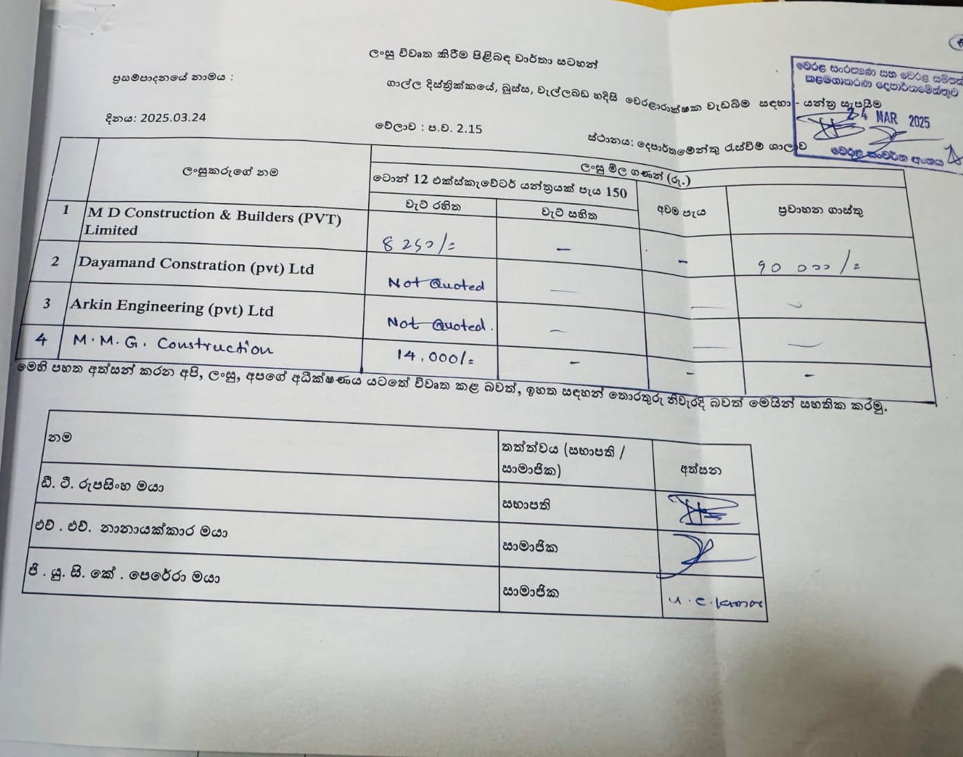 වෙරළ සංරක්ෂණ දෙපාර්තමේන්තුවේ ලියාපදිංචි සැපයුම් කරුවන් වන M. D. Construction, Dayamond Construction සහ Arkin Engineering (PVT) Ltd යන ආයතන වලින් ලංසු කැඳවා ඇති නමුත්, ටෙන්ඩරය විවෘත කළ විට ලංසු ඉදිරිපත් කොට තිබී ඇත්තේ M. D. Construction ආයතනය පමණි. එම ආයතනය ඉදිරිපත් කර තිබූ ලංසු මිල ගණන් වන්නේ, ටොන් 12 එක්ස්කැවේටර් යන්ත්රයට පැයක් සඳහා රු. 8250 ක් සහ එක් දිනක් සඳහා කියුබ් 3 ටිපර් රථයක් වෙනුවෙන් රු. 38500 කි.