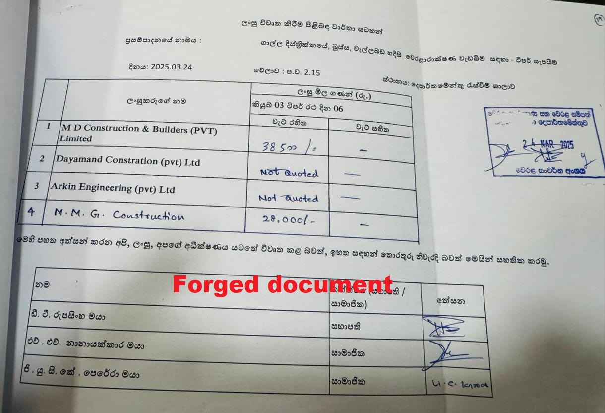 ලංසු ලේඛන කූට ලෙස වෙනස් කිරීම, වංචා සහගතව ව්යාජ ලංසුවක් ලංසු ලේඛන වලට ඇතුලත් කිරීම, ඔහුට අදාළ නොමැති කාර්යයක් වන තාක්ෂණික ඇගැයීම් වාර්තාවක් සකස් කිරීම, එසේම එම වාර්තාව තාක්ෂණික ඇගැයීම් කමිටුවේ සමාජිකයන්ව රවටා අත්සන් ලබා ගැනීම, සුළු ප්රසම්පාදන කමිටුව නොමඟ යවා කමිටුවේ අනුමැතිය ලබා ගැනීමට උත්සාහ දැරීම, රජයේ මුදල් භාවිතා කොට තම හිතවතුන්ගේ හෝටල් ආරක්ෂා කිරීමට උත්සාහ කිරීම සහ ප්රසම්පාදන අනුමැතිය ලැබීමට පෙර අදාළ ඉඳිකිරීම් සිදු කිරීම යන දූෂිත සහ අනීතික කටයුතු විශාල ප්රමාණයක් මෙම නිලධාරියා විසින් සිදු කොට ඇත. මීට අදාළ සියලු ලිඛිත සාක්ෂි අප සතුව ඇත. ඉන් කිහිපයක් පමණක් අපි අද මේ වාර්තාව සමඟ ඉදිරිපත් කරමු. (ලංසු ලේඛනය සහ කූඨ ලෙස සැකසූ ලංසු ලේඛනය ඉමේජ වල දැක්වේ - බලන්න)