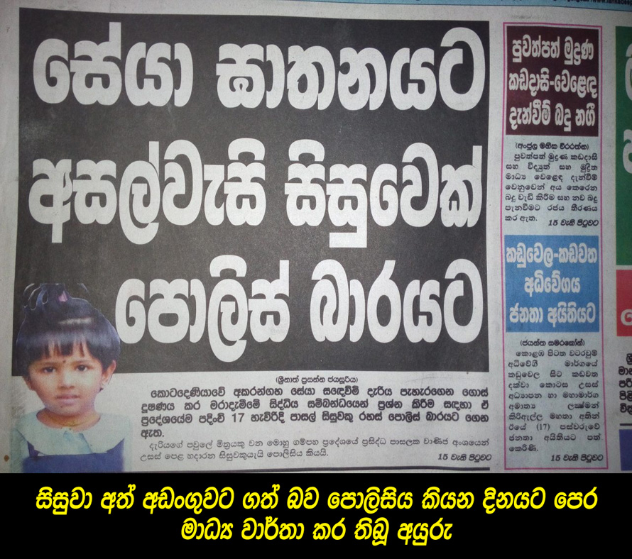 පාසල් සිසුවා සහ එක්දරු පියා අත්අඩංගුවට ගත්තේ සැප්තැම්බර 18 රාත්රී බවට පොලිසිය බොරු සටහන් යෙදුව ද 17 වැනි දා සහ 18 වැනි දා පුවත් පත් කිහිපයකම ගම්පහ ප්රසිද්ධ පාසලක සිසුවකු සහ 33 හැවිරිදි එක්දරු පියකු අත්අඩංගුවට ගෙන ප්රශ්න කරන බව වාර්තා කළේය. 18 සිකුරාදා ලංකාදීපයේ එය මුල් පුවත ලෙස පළ වී තිබුණේය.