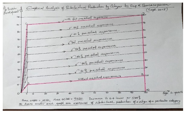 The graph -01 at here OCD indicates the highest brain development of a person with the best possible preschool experience. The area OCDB represents the intellectual production of a person in this category over 100 years.