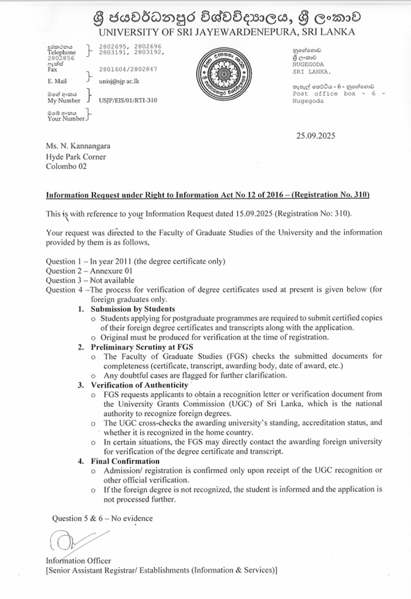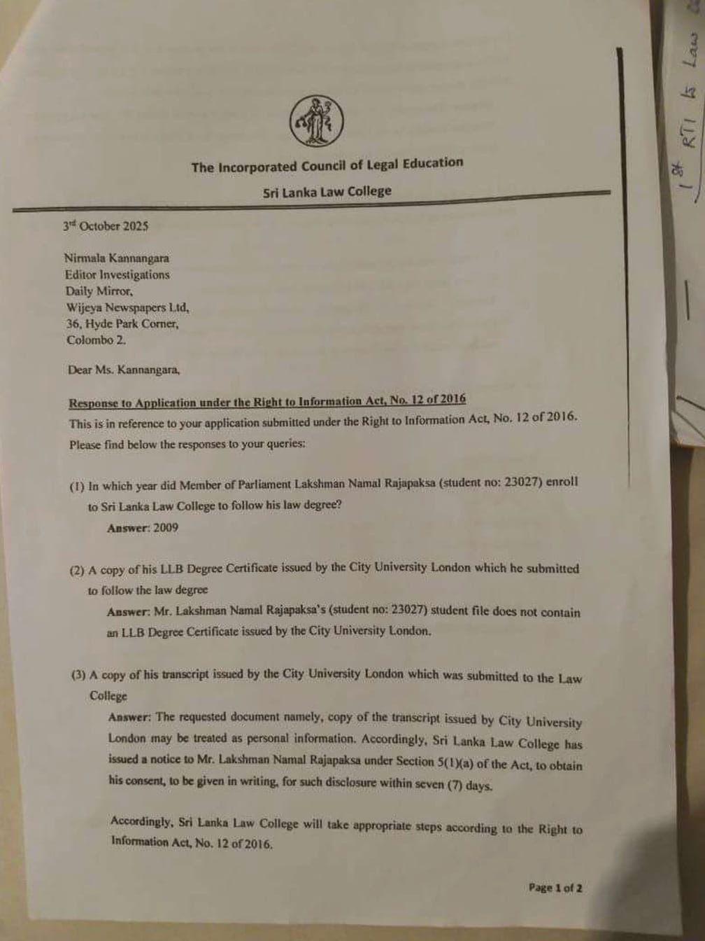 RTI responses from Sri Lanka Law College confirm they never received a copy of Namal’s degree certificate.