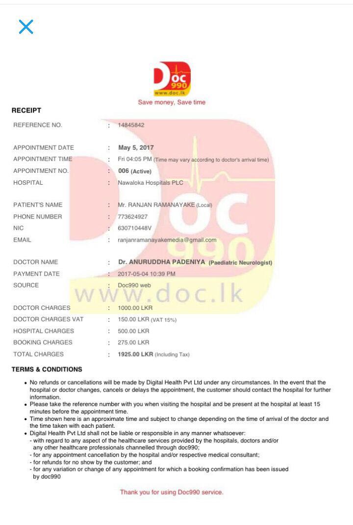 මෙහි දැක්වෙන්නේ GMOA නායක ජොස්තර පාදෙණියව අද(05) සවස 4.05 ට රෝගී පරීක්ෂාවකට හමුවීම සඳහා නවලෝක රෝහල විසින් ලබා දුන් රිසිට්ටුවයි. රන්ජන් මෙම හමුවීම ලබාගෙන ඇත්තේ ඊයේ රාත්රී 10.30 ට පමණ ය. එහිදී ජොස්තර පාදෙණිය ගේ චැනලින් ගාස්තුව ලෙස රුපියල් 1000 ක් ද, රෝහල් ගාස්තුව ලෙස රුපියල් 500 ක් ද, වැට් බද්ද ලෙස රුපියල් 150 ක්ද, පෙර වෙන් කර ගැනීමේ ගාස්තුව ලෙස රුපියල් 275 ක් ද වශයෙන් මුළු මුදල රු. 1925 ක් ගෙවා තිබේ.