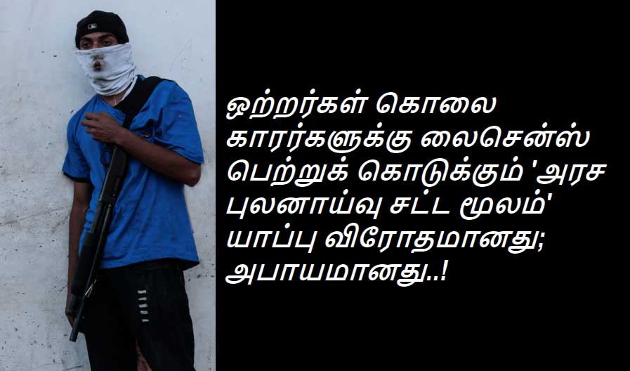 உண்மையில் புலனாய்வு அதிகாரிகள் என்ற சொல் ஒற்றர்களுக்கு வழங்கப்படும் மறைமுக பெயராகும். ஹிட்லரின் ஆட்சியில் ஒற்றர்களாக இருந்த கொலைகார குழுவினரான கெஸ்டோபோவன் என்பவர்களை யாவரும் அறிவர். நந்தசேனவின் தற்போதைய சட்டமூலம் கெஸ்டோபோவன்களை விட மிகவும் அபாயகரமான கொலைக் குழுவினர்களை இலங்கையில் உருவாக வாய்ப்பு உள்ளது. இதன் மூலம் எதிர்க்கட்சி உறுப்பினர்கள் மாத்திரமன்றி அரசாங்கத்திற்குள் நந்தசேனவிற்கு எதிராக செயற்படும் நபர்களும் பலி எடுக்கப்பட உள்ளன. எனவே யுத்த காலத்தில் புலனாய்வு பிரிவினருக்கு விடுதலை அளிக்கும் ஏற்பாடுகள் இல்லை என்றபோதும் தற்போதைய காலத்தில் அவ்வாறானதொரு விடுதலை அளிப்பு ஏன் என்ற சந்தேகம் வலுக்கிறது. நாட்டு மக்கள் அனைவரும் இந்த கேள்வியை எழுப்ப வேண்டும்.