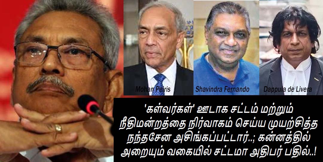 சட்டத்தை மதிக்காது பைத்திய நாடகமாடும் நந்தசேனவின் செயல்பாடுகள் மீண்டும் ஒருமுறை சவாலுக்கு உட்படுத்தப்பட்டுள்ளன. கப்பம் பெறும் நோக்கில் 11 மாணவர்களை கடத்தி காணாமல் செய்யப்பட்ட சம்பவத்துடன் தொடர்புடைய வழக்கு விசேட மேல் நீதிமன்ற நீதிபதிகள் மேல் நீதிமன்றத்தில் குற்றப்பத்திரிகை தாக்கல் செய்யப்பட்டுள்ள முன்னாள் கடற்படைத் தளபதி வசந்த கரன்னாகொட மற்றும் முன்னாள் கடற்படை இராணுவப் பேச்சாளர் டி.கே.பி தசநாயக்க ஆகியோருக்கு எதிரான குற்றப்பத்திரிகை மற்றும் வழக்கு விசாரணைகளை அரசியல் பழிவாங்கல் தொடர்பான விடயங்களை ஆராயும் நந்தசேனவின் ஆணைக்குழு இறுதி பரிந்துரைகள் வரும்வரை நிறுத்தி வைக்குமாறு ஜனாதிபதி ஆணைக்குழு சட்டமா அதிபருக்கு பிறப்பித்த உத்தரவை சட்டமா அதிபர் தப்புல லிவேரா நிராகரித்துள்ளார். இதன் மூலம் கள்வர்கள் கூட்டத்திற்கு மத்தியில் மாட்டிக் கொண்டு தப்புல லிவேரா சட்டமா அதிபர் செயல்படுவது புலனாகிறது.