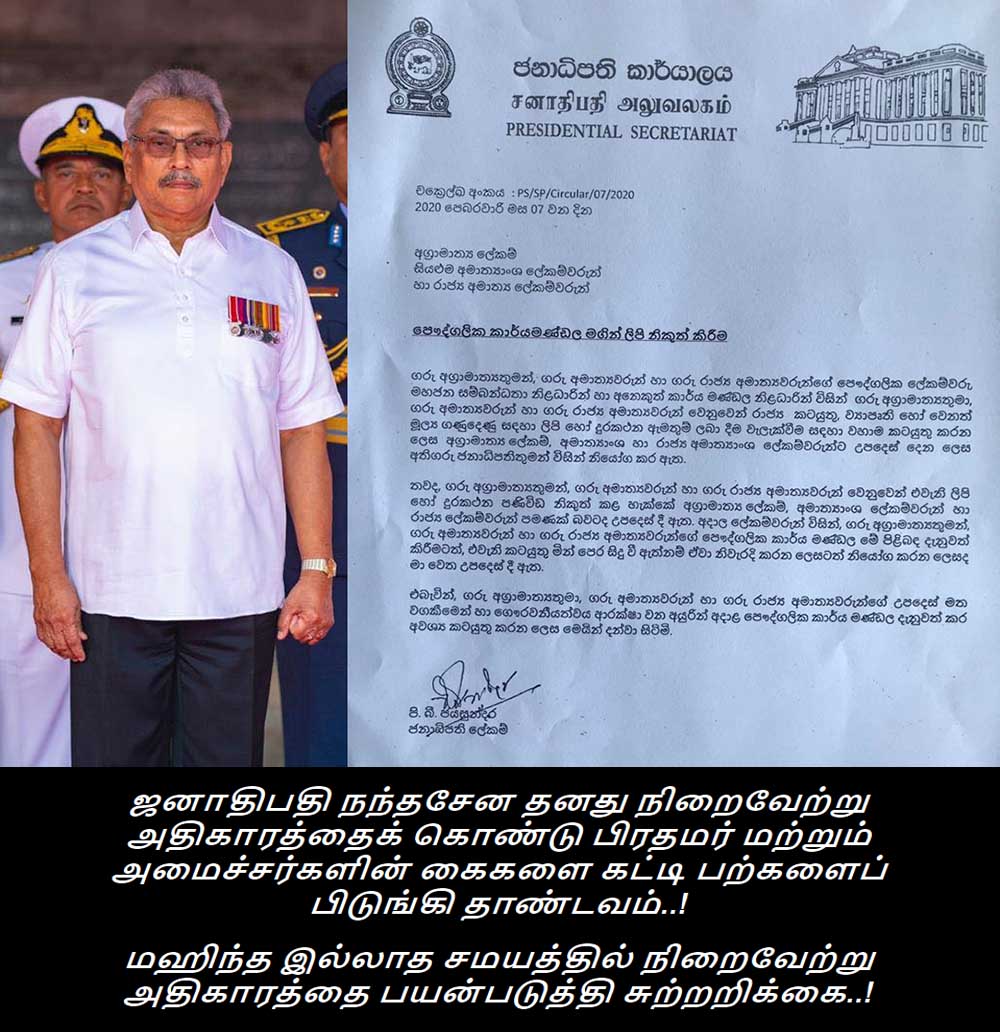ஜனாதிபதியின் PS/SP/Circular/07/2020 சுற்றறிக்கை இலக்கம் மூலமாக பிறப்பிக்கப்பட்டுள்ள உத்தரவின்படி பிரதமர் மஹிந்த ராஜபக்ஷ அமைச்சரவை அந்தஸ்துள்ள அமைச்சர்கள் மற்றும் இராஜாங்க அமைச்சர்களின் பிரத்தியேக செயலாளர்கள், மக்கள் தொடர்பு அதிகாரிகள் உள்ளிட்ட தனிப்பட்ட செயலாளர்கள் குழுவினால் அரச வேலைத் திட்டங்கள் உள்ளிட்ட ஏனைய நடவடிக்கைகள் தொடர்பாக தொலைபேசி அழைப்பு விடுத்தல் கடிதம் அனுப்புதல் போன்றவற்றை உடனடியாக நிறுத்துமாறு கட்டளை பிறப்பிக்கப்பட்டுள்ளது. இவை அனைத்தையும் பிரதமரின் செயலாளர் அல்லது அமைச்சர்களின் செயலாளர்கள் மாத்திரமே செயற்படுத்த முடியும் எனவும் இதற்கு முன்னர் அவ்வாறு அனுப்பப்பட்டுள்ள கடிதங்களை ரத்து செய்யுமாறும் சுற்றறிக்கையில் மேலும் தெரிவிக்கப்பட்டுள்ளது. (முழுமையான சுற்றறிக்கை கீழே தரப்பட்டுள்ளது)