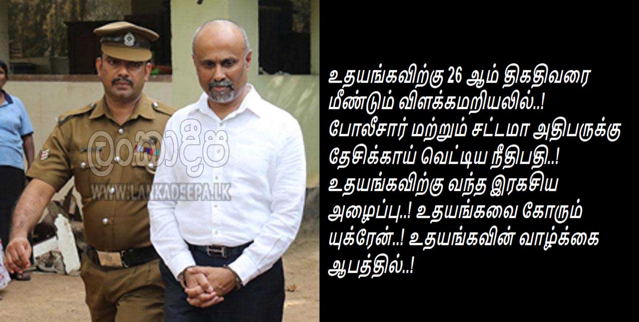 (லங்கா ஈ நியூஸ் 2020 பெப்ரவரி 18 முற்பகல் 06.30) பிரபல்யமான மிக் விமான ஊழல் மற்றும் யுக்ரேன் நாட்டின் கிளர்ச்சி படைக்கு தமிழீழ விடுதலைப் புலிகள் இயக்கத்திடமிருந்து மீட்கப்பட்ட ஆயுதங்களை விற்பனை செய்தமை மற்றும் நபர் ஒருவரை ரகசியமாக கொலை செய்தமை போன்ற குற்றச்சாட்டுகளுடன் தொடர்புடைய சந்தேகத்தின் பேரில் கைது செய்யப்பட்டுள்ள ஜனாதிபதி மற்றும் பிரதமரின் உறவு சகோதரனும் ரஷ்யாவுக்கான இலங்கையின் முன்னாள் தூதுவருமான உதயங்க வீரதுங்க நீதிமன்றத்தில் மீண்டும் முன்னிலைப் படுத்தப்பட்ட போது அவரை எதிர்வரும் 26 ஆம் திகதி வரை தொடர்ந்தும் விளக்கமறியலில் வைக்குமாறு கொழும்பு பிரதான நீதவான் ரங்க திசாநாயக்க உத்தரவு பிறப்பித்துள்ளார்.