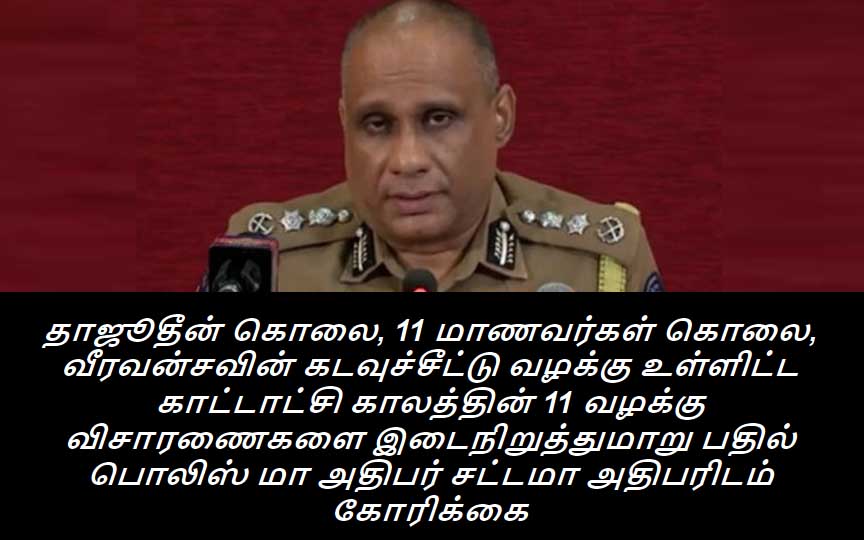 (லங்கா ஈ நியூஸ் 2020 பெப்ரவரி 25 பிற்பகல் 12.30) சந்தேகநபர்களுக்கு குற்றப்பத்திரிகை தாக்கல் செய்யப்பட்டுள்ள ரகர் வீரர் வசீம் தாஜுதீன் கொலை வழக்கு, கடற்படையினரின் கொலை கும்பலால் 11 மாணவர்களை கப்பம் பெறும் நோக்கில் கடத்தி கொலை செய்த வழக்கு உள்ளிட்ட 11 வழக்கு விசாரணைகள் தொடர்பிலான மேலதிக நடவடிக்கைகளை இடை நிறுத்துமாறு பதில் பொலிஸ் மா அதிபர் சி டி விக்ரமரத்ன சட்டமா அதிபரிடம் எழுத்து மூலம் கோரிக்கை விடுத்துள்ளதாக லங்கா ஈ நியூஸ் உள்ளக சேவைக்கு தகவல் வந்துள்ளது.