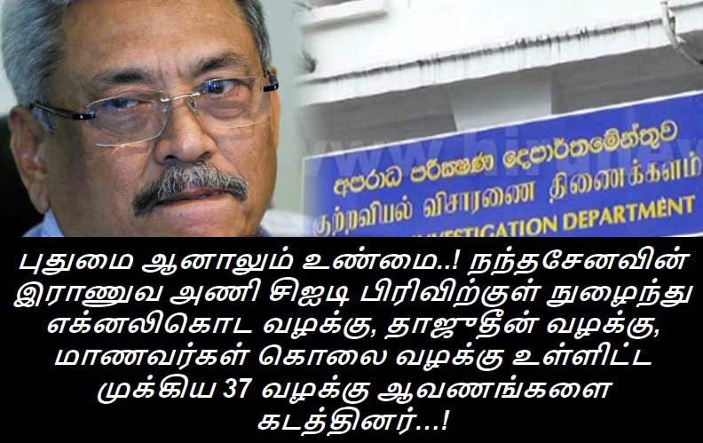 (லங்கா ஈ நியூஸ் 2020 பெப்ரவரி 28 பிற்பகல் 07.15) ஜனாதிபதி நந்தசேன கோட்டாபய இலங்கை நிர்வாக சேவையில் பிரிவான போலீஸ் துறையை இராணுவ மயமாக்கி வரும் உச்சக்கட்ட நிலையில் 1797 ஆம் ஆண்டு பெட்ரிக் பேரன் மயிலியஸ் என்பவரினால் நாட்டு மக்களின் சிவில் சேவைக்கான ஏற்படுத்தப்பட்ட பொலிஸ் துறையின் குற்ற விசாரணை திணைக்களம் என்ற சிஐடி பிரிவிற்கு மிலிட்டரி பிரிவை அனுப்பி பாரிய குற்றங்கள் தொடர்பில் விசாரணை நடத்தப்பட்டு வந்த 37 விசாரணைகளுக்கான கோவைகளை 25ம் திகதி இரவு இராணுவப் புலனாய்வுப் பிரிவினர் சட்ட விரோதமாக கடத்திச் சென்றுள்ளதாக இலங்கை சட்டத்தை மதிக்கும் மக்களுக்கு தெரிவிக்க வேண்டியுள்ளது.