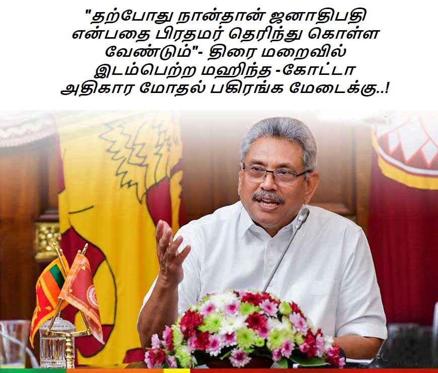 (லங்கா ஈ நியூஸ் 2020 மார்ச் 11 பிற்பகல் 08.55) இதுவரை காலமும் திரைக்குப் பின்னால் இடம்பெற்ற மஹிந்த - கோட்டாபய அதிகார மோதல் இன்று பகிரங்கமாக மேடையில் அரங்கேற்றப்பட்டுள்ளது. "தற்போது நான் தான் ஜனாதிபதி என்பதை பிரதமர் தெரிந்து கொள்ள வேண்டும்" என ஜனாதிபதி கோட்டாபய ராஜபக்ச இன்று பகிரங்கமாக தெரிவித்ததால் திரைக்குப் பின்னால் நடந்த மோதல் வெளிச்சத்திற்கு வந்துள்ளது.