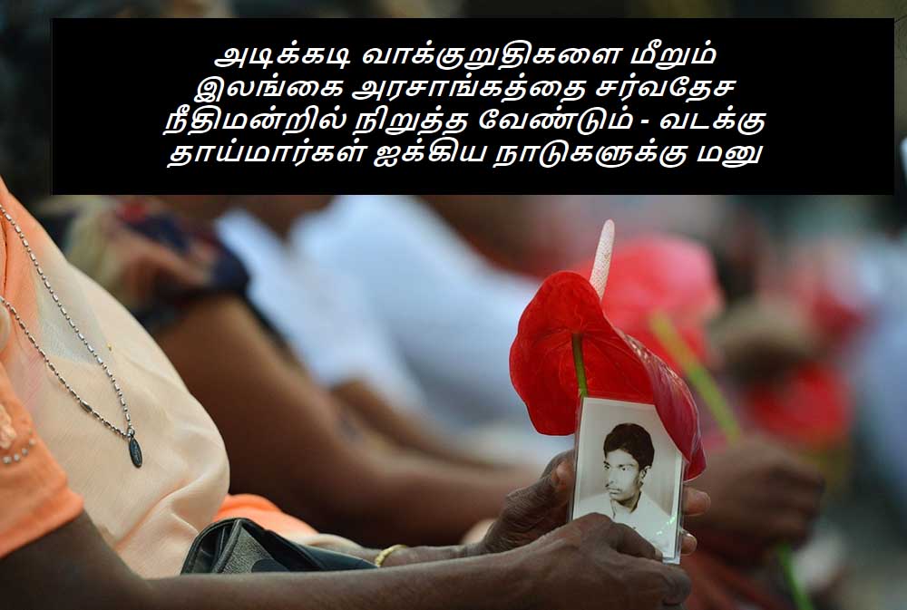 முல்லைத்தீவு செல்வபுரம் பிரதேசத்திலிருந்து மாவட்ட செயலகம் வரை 2020 மார்ச் எட்டாம் திகதி ஞாயிற்றுக்கிழமை பேரணியாக வந்த காணாமலாக்கப்பட்ட நபர்களின் தாய்மார் ஜெனிவா நகரில் நடைபெறும் ஐக்கிய நாடுகள் மனித உரிமை சபையின் நாற்பத்து மூன்றாவது அமர்வில் முன்வைக்கவென மனு ஒன்றை கையளித்தது இலங்கை அரசாங்கத்தை சர்வதேச நீதிமன்றத்தில் நிறுத்துவதற்கு ஐக்கிய நாடுகள் சபையின் பாதுகாப்பு சபைக்கு இந்த மனுவை அனுப்பி வைக்குமாறு கோரிக்கை விடுத்தனர்.