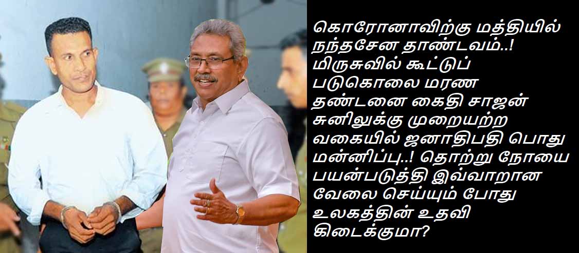 இது இவ்வாறு இருக்கையில் இலங்கையில் காட்டாட்சி நடத்தும் ஆட்சியாளரான நந்தசேன கோட்டாபய 26 ஆம் தேதி ஆகிய இன்று ஐந்து வயது குழந்தை உள்ளிட்ட யுத்தத்தால் கைவிடப்பட்ட 8 பேரை கூரிய ஆயுதத்தால் வெட்டி கூட்டுக் கொலை செய்த குற்றத்திற்காக மரண தண்டனை விதிக்கப்பட்டிருந்த சாஜன் சுனில் ரத்னாயக்க என்பவரை மாத்திரம் ஜனாதிபதி பொது மன்னிப்பில் விடுதலை செய்துள்ளார்.