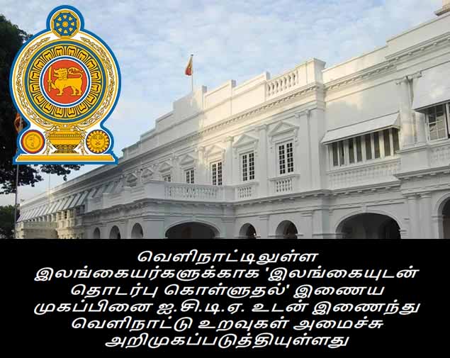 (லங்கா ஈ நியூஸ் 2020 மார்ச் 27 பிற்பகல் 06.25) வெளிநாட்டிலுள்ள இலங்கையர்களின் நலனுக்காக இலங்கையின் தகவல் மற்றும் தொடர்பாடல் தொழில்நுட்ப நிறுவனம் (ஐ.சி.டி.ஏ) மற்றும் வெளிநாட்டு உறவுகள் அமைச்சு ஆகியன இணைந்து உருவாக்கிய 'இலங்கையுடன் தொடர்பு கொள்ளுதல்' இணைய முகப்பு இன்று (26 மார்ச் 2020) வெளிநாட்டு உறவுகள் அமைச்சில் ஆரம்பித்து வைக்கப்பட்டது. இதற்கான வலைத்தள இணைப்பினை அமைச்சின் வலைத்தளப் பக்கமான www.mfa.gov.lk முகவரியிலும், மற்றும் www.contactsrilanka.mfa.gov.lk என்ற இணையத்தளத்திலும் அணுகிக் கொள்ளலாம்.