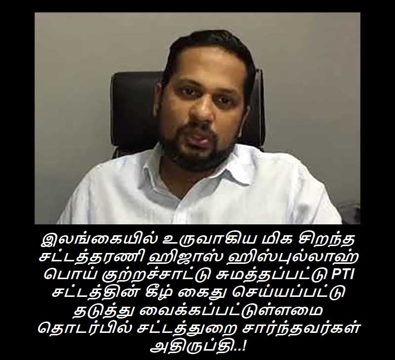 (லங்கா ஈ நியூஸ் 2020 ஏப்ரல் 15 பிற்பகல் 11.30) மனித உரிமைகள் மற்றும் மனித விடுதலைக்காக சிவில் மற்றும் குற்ற வழக்குகள் மூலம் முன்னிலையாகும் இலங்கையில் உருவாக்கிய சிறந்த சட்டத்தரணியான ஹிஜாஸ் ஹிஸ்புல்லாஹ் கோட்டாபய ராஜபக்சவின் பொலிஸ், இராணுவ அரசாங்கத்தால் பொய் குற்றச்சாட்டு சுமத்தப்பட்டு பயங்கரவாத தடுப்புச் சட்டத்தின் கீழ் கைது செய்யப்பட்டு பாதுகாப்பு செயலாளரின் தடுத்து வைக்கும் உத்தரவின் அடிப்படையில் விளக்கமறியலில் வைக்கப்பட்டுள்ளமை தொடர்பில் இலங்கையிலுள்ள சட்டத்துறை சார்ந்த வல்லுனர்கள் மற்றும் சுதந்திரத்தை விரும்பும் பொதுமக்கள் மிகவும் கவலை அடைந்துள்ளதாக லங்கா ஈ நியூஸ் இணையத்திற்கு செய்தி வந்துள்ளது.