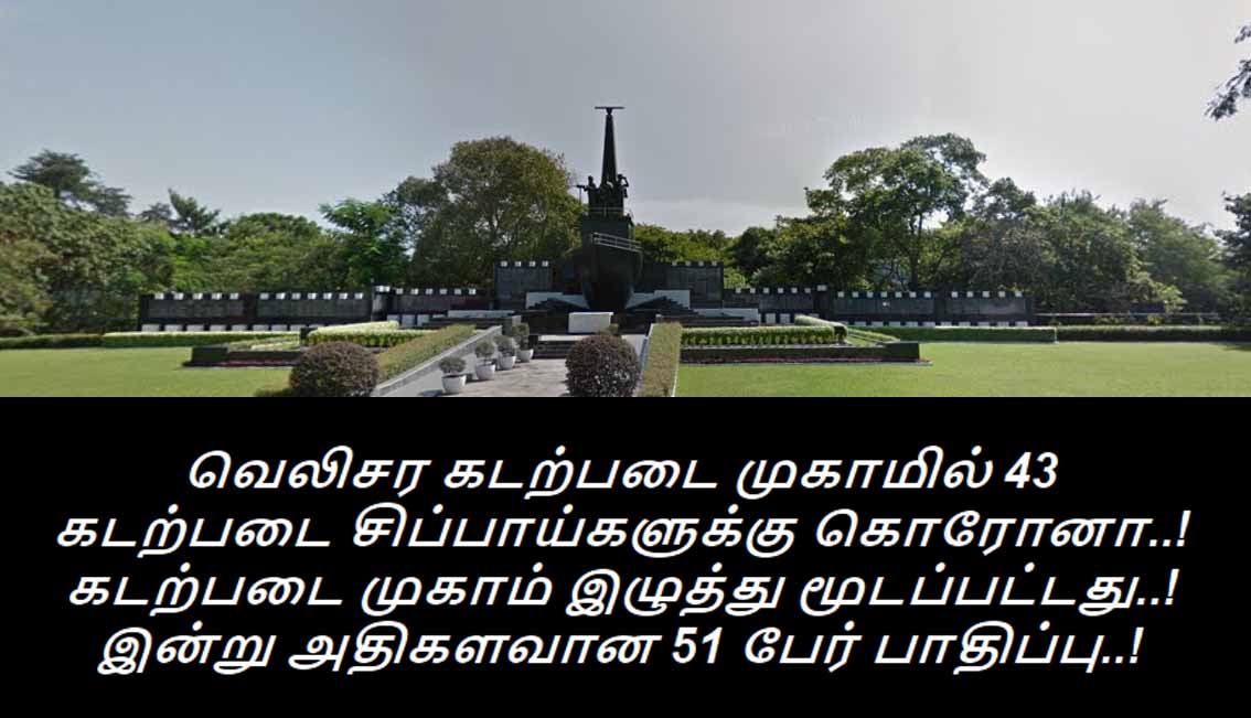 இன்றைய தினம் வெளிசர கடற்படை முகாமில் சுமார் 60 கடற்படை வீரர்களுக்கு கொரோனா பரிசோதனை மேற்கொள்ளப்பட்ட நிலையில் அதில் 43 கடற்படை வீரர்களுக்கு கொரோனா தொற்று இருப்பது உறுதி செய்யப்பட்டுள்ளது. இந்த சம்பவத்தை அடுத்து வெலிசர கடற்படை முகாம் முற்றாக இழுத்து மூடப்பட்டுள்ளது.
