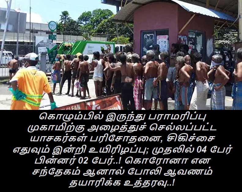 (லங்கா ஈ நியூஸ் 2020 மே 02 முற்பகல் 06.00) கொழும்பு குணசிங்கபுர பகுதியில் இருந்து பிடித்து பராமரிப்பு நிலையங்களுக்கு அழைத்துச் செல்லப்பட்டு எவ்வித பரிசோதனை மற்றும் சிகிச்சைகள் இன்றி கொரோனா என சந்தேகிக்கப்படும் மரணங்கள் வைரஸ் மற்றும் வலிப்பு போன்ற காரணங்களால் உயிரிழந்ததாக போலி ஆவணங்களை தயாரித்து கொரோனா மரண நபர்களை போன்று பொலித்தீன் உரையில் மூடி எரியூட்டி இறுதிக் கிரியைகள் செய்யப்பட்டுள்ளதாக லங்கா ஈ நியூஸ் இணையத்திற்கு செய்தி வந்துள்ளது.