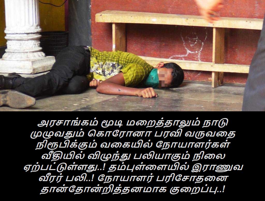 உலகில் கொரோனா நோயினால் பாதிக்கப்பட்டுள்ள ஏனைய நாடுகள் பரிசோதனை நடவடிக்கைகளை நாளுக்கு நாள் அதிகரித்து செல்லும் நிலையில் இலங்கை தலைகீழாக செயல்பட்டு பரிசோதனை நடவடிக்கைகளை குறைத்துக் கொண்டு வருகிறது. இந்த அபாயமான நடவடிக்கை காரணமாக நாட்டு மக்கள் பாரிய ஆபத்தை எதிர்நோக்க வேண்டி வரலாம். இதனாலேயே நடு வீதிகளில் விழுந்து சாகும் நிலை ஏற்பட்டுள்ளது.