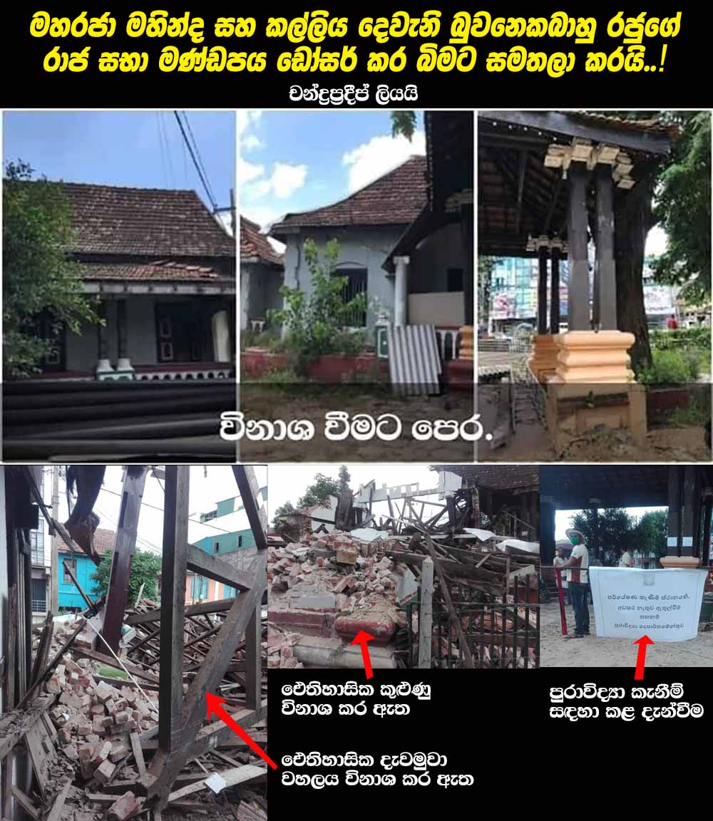 (லங்கா ஈ நியூஸ் 2020 ஜூலை 17 பிற்பகல் 10.30) தேசிய தொல் பொருட்களை பாதுகாப்பதாக விகாரைகள் தோறும் சென்று பத்து விரல்களையும் நீட்டி சத்தியம் செய்து உறுதி அளித்துவிட்டு ஆட்சிக்கு வந்த 'தேசப்பிரிய' மஹிந்த ராஜபக்ஷ உள்ளிட்ட குழுவினர் வரலாற்று சிறப்புமிக்க தொல்பொருள் இடமான பெறுமதிவாய்ந்த சுமார் 700 வருடங்கள் பழமை வாய்ந்த இரண்டாம் புவனேகபாகு மன்னரின் ராஜ்யசபை மண்டபத்தை கடந்த 14ஆம் திகதி அனைவரும் நித்திரையில் இருக்கும் நள்ளிரவு வேளையில் புல்டோசர் கொண்டு தரைமட்டமாக்கிய செய்தியை தேசிய துக்ககர சம்பவமாக தெரிவித்துக் கொள்கிறோம்.