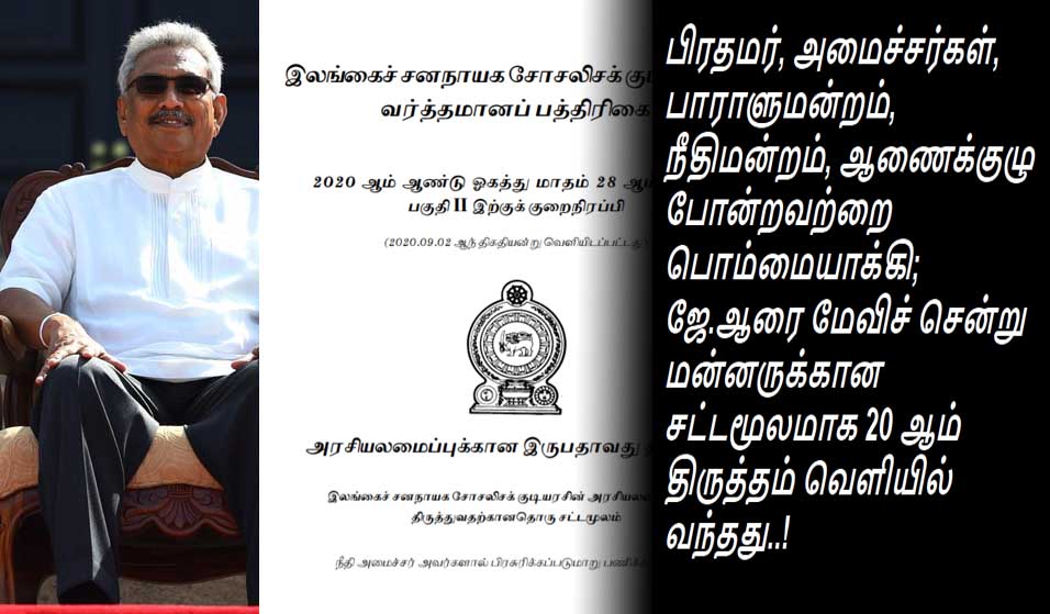 (லங்கா ஈ நியூஸ் 2020 செப்டம்பர் 04 பிற்பகல் 09.35) இலங்கையின் முன்னாள் ஜனாதிபதி ஜே ஆர் ஜெயவர்தன 1978 ஆம் ஆண்டு நிறைவேற்று அதிகாரமுடைய ஜனாதிபதியாக தன்னகத்தே வைத்திருந்த ஏகாதிபதித்துவத்தை அதிகரிக்கும் அதிகாரங்களில் ஒரு பகுதியை பிரதமர் மற்றும் பாராளுமன்றத்திற்கு வழங்கி ஜனநாயக நிலையை ஏற்படுத்தவென கொண்டு வரப்பட்ட 19 ஆவது திருத்தச் சட்டத்தை முழுமையாக நீக்கி பிரதமரை பிச்சைக்காரனாக மாற்றி அமைச்சரவை பாராளுமன்றம் நீதிமன்றம் என்பவற்றை பொம்மையாக மாற்றி ஜனாதிபதி பதவிக்கு ஜே ஆர் ஜெயவர்தன வசமிருந்த அதிகாரங்களையும் மேவிச் சென்று 20 ஆவது அரசியலமைப்புத் திருத்தச் சட்டமூலம் வெளியிடப்பட்டுள்ளது.