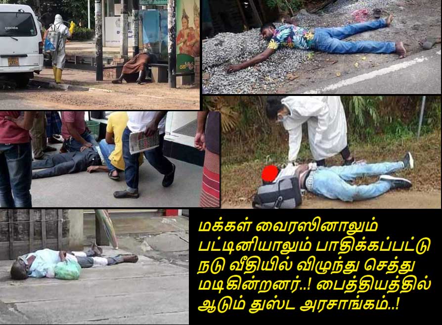 இங்கு காணப்படும் புகைப்படங்களில் புத்தளம், கம்பஹா, கண்டி பேராதெனிய, மஹவெல போன்ற பகுதிகளில் நடு வீதியில் விழுந்து செத்து மடிந்த நபர்கள் இருக்கின்றனர். அது மாத்திரமன்றி பலர் சிகிச்சை இன்றி வீடுகளில் செத்து மடிவதாக தெரிய வந்துள்ளது. சிலர் கொரோனா தொற்று அல்லாமல் வேறு நோய்களுக்கு சிகிச்சைப் பெற்றுக் கொள்ள முடியாத நிலையில் உயிரிழக்கின்றனர். உதாரணமாக அத்துருகிரிய பகுதியில் பெண் ஒருவர் நீரிழிவு நோயினால் பாதிக்கப்பட்டு சிகிச்சை பெற்று வந்த நிலையில் வைத்தியசாலையில் இருந்து வீட்டுக்கு அனுப்பி வைக்கப்பட்டுள்ளார். அவர் இரத்த மாற்றம் செய்ய வழியின்றி உயிரிழந்துள்ளார். கொரோனா நோயாளர்களை தங்க வைப்பதன் நோக்கில் குறித்த பெண் வீட்டுக்கு அனுப்பி வைக்கப்பட்டுள்ளார். வாரத்திற்கு ஒரு முறை இரத்தம் மாற்ற முடியாமல் போனதால் குறித்த பெண் வீட்டிற்குள் உயிரிழந்துள்ளார். சிலர் வைரஸ் தொற்றுடன் இராணுவ கெடுபிடிகளால் ஏற்பட்ட மன உலைச்சல் காரணமாக தற்கொலை செய்து கொண்டுள்ளனர்.