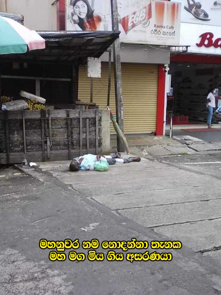 நாட்டு மக்கள் வைரஸ் காரணமாக நடு வீதியில் விழுந்து செத்து மடிவதாக லங்கா ஈ நியூஸ் இதற்கு முன்னர் செய்தி வௌியிட்ட போது அதனை பொய் என்றார்கள். ஆனால் அதனை நிரூபிக்கக் கூடிய புகைப்படங்கள் எம்மிடம் உள்ளன. நாட்டில் தற்போது காணப்படும் லொக் டவுன் நிலை, இராணுவத்தின் மீதான அச்சம் போன்ற காரணங்களால் பல உண்மை தகவல்களை வௌியில் கொண்டுவர முடியாமல் உள்ளது. எனினும் சில ஆதாரத்துடன் கூடிய புகைப்படங்களை நாம் தருகிறோம்.