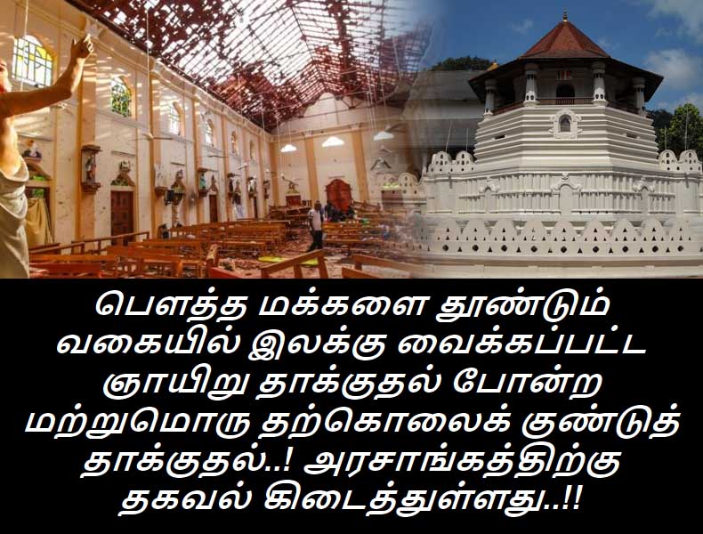 (லங்கா ஈ நியூஸ் - 2020 , நவம்பர் 22 பிற்பகல் 09.50) ஞாயிறு தற்கொலை குண்டுத் தாக்குதல் போன்ற மற்றுமொரு தற்கொலைக் குண்டுத் தாக்குதலை கண்டி தலதா மாளிகையை இலக்கு வைத்து அல்லது அவ்வாறு பௌத்த முக்கியத்துவம் வாய்ந்த நிலையத்தை இலக்கு வைத்து தாக்குதல் நடத்தும் திட்டம் ஒன்று உள்ளதென சர்வதேச புலனாய்வு பிரிவினர் இலங்கை அரசாங்கத்தின் பாதுகாப்பு தரப்பிடம் அறிவித்ததாக லங்கா ஈ நியூஸ் உள்ளக சேவைக்கு தகவல் வந்துள்ளது.