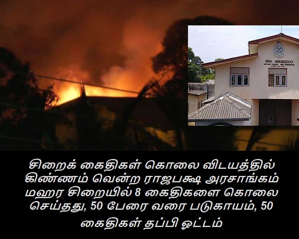 (லங்கா ஈ நியூஸ் - 2020 நவம்பர் 30 பிற்பகல் 01.30) சிறைச்சாலை கைதிகள் கொலை விடயத்தில் வரலாற்றில் பிரபல இடம் பிடித்துள்ள கோட்டாபய ராஜபக்ஷவின் அரசாங்கம் மஹர சிறையில் நீண்ட நேரம் மேற்கொண்ட துப்பாக்கிச் சூட்டுச் சம்பவத்தில் 8 கைதிகள் கொல்லப்பட்டுள்ளதுடன் 50ற்கும் மேற்பட்ட கைதிகள் படுகாயம் அடைந்துள்ளனர். ( கொல்லப்பட்ட கைதிகளின் எண்ணிக்கை மேலும் அதிகரிக்கக் கூடும் என கூறப்படுகிறது)