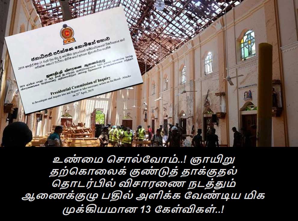 (லங்கா ஈ நியூஸ் - 2020 டிசம்பர் 01 பிற்பகல் 09.30) கடந்த 2019ம் ஆண்டு ஏப்ரல் மாதம் 21ம் திகதி ஏசு உயிர்த்த ஞாயிறு தினத்தில் இலங்கை கிறிஸ்தவர்களை இலக்கு வைத்து பிரதான நட்சத்திர ஹோட்டல்களை இலக்கு வைத்து மேற்கொள்ளப்பட்ட தற்கொலைக் குண்டுத் தாக்குதல்கள் தொடர்பில் விசாரணை நடத்தும் ஜனாதிபதி விசாரணை ஆணைக்குழுவின் ஊடாக தற்போது வரை பெறப்பட்ட சாட்சிகள் மற்றும் வௌியிடப்பட்டுள்ள உண்மைகள், ஊடக செய்திகள் என்பவற்றை அடிப்படையாகக் கொண்டு தாக்குதலில் கொல்லப்பட்ட, காயமடைந்த, பாதிக்கப்பட்டவர்கள் நியாயம் வேண்டி நிற்கும் நிலையில் கீழ் காணும் கேள்விகளுக்கு பக்கச்சார்பற்ற பதில்கள் மக்களுக்கு வழங்கப்பட வேண்டும்.