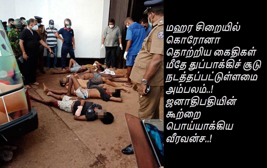 (லங்கா ஈ நியூஸ் - 2020 டிசம்பர் 01 பிற்பகல் 04.30) அரசாங்கத்தின் உயர் இடத்து உத்தரவின் பேரில் துப்பாக்கிச் சூடு நடத்தப்பட்டது கொரோனா வைரஸினால் பாதிக்கப்பட்ட கைதிகள் மீதே என்பது தற்போது உறுதி செய்யப்பட்டுள்ளது. துப்பாக்கிச் சூட்டில் காயமடைந்து ராகம வைத்தியசாலையில் அனுமதிக்கப்பட்ட 105 கைதிகளுக்கு மேற்கொள்ளப்பட்ட பீ சீ ஆர் பரிசோதனையில் சுமார் 30ற்கும் அதிகமான கைதிகளுக்கு கொரோனா தொற்று இருப்பது உறுதி செய்யப்பட்டுள்ளது. சுட்டுக் கொல்லப்பட்ட கைதிகளின் சடலங்கள் வைத்தியசாலையில் வைக்கப்பட்டுள்ள போதும் இன்னும் பீ சீ ஆர் பரிசோதனை மேற்கொள்ளப்படவில்லை. எனவே தப்பிச் செல்ல முயற்சித்த சிறைக் கைதிகள் மீது பொலிஸார் துப்பாக்கிச் சூடு நடத்தியதாக அரசாங்கம் வௌியிட்டுள்ள கருத்து முற்றிலும் பொய்யானது என்பதுடன் கொரோனா தொற்று நோயாளிகள் மீது துப்பாக்கிச் சூடு நடத்திய ஒரே நாடு இலங்கை என்ற அவப்பெயர் வருவதை தவிர்ப்பதற்கு இவ்வாறு கருத்து வௌியிட்டுள்ளமை தெரியவந்துள்ளது.