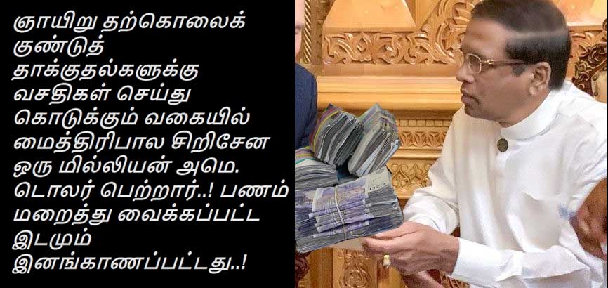 (லங்கா ஈ நியூஸ் - 2020 , டிசம்பர் 25, பிற்பகல் 05.45) ஞாயிறு தற்கொலைக் குண்டுத் தாக்குதல்களுக்கு வசதி ஏற்படுத்திக் கொடுத்தல் மற்றும் அதன் பின்னணியில் இருந்த சந்தேகநபர்கள் தொடர்பான தகவல்களை மறைப்பதற்காக அப்போதைய நாட்டுத் தலைவராக செயற்பட்ட பல்லேவத்த கமராலாகே மைத்திரிபால யாப்பா சிறிசேன என்பவர் வௌிநாட்டு சக்தி ஒன்றின் ஊடாக ஒரு மில்லியன் அமெரிக்க டொலர் என்ற 19 கோடி ரூபாவை பெற்றுக் கொண்டதாக லங்கா ஈ நியூஸ் உள்ளக செய்தி சேவைக்கு தகவல் வந்துள்ளது.