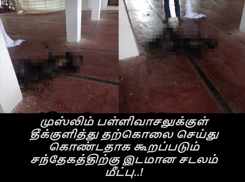 சடலம் காணப்படும் பள்ளிவாசல் புகைப்படத்தை பார்க்கும் போது குறித்த இடத்தில் ஒருவர் தீ வைத்துக் கொண்டதற்கான அடையாளங்கள் இல்லை. வேறு இடத்தில் எரியுண்ட சடலத்தை பள்ளிவாசலுக்குள் கொண்டுவந்து போட்டுள்ளதாக புகைப்படத்தில் தெரிகிறது.