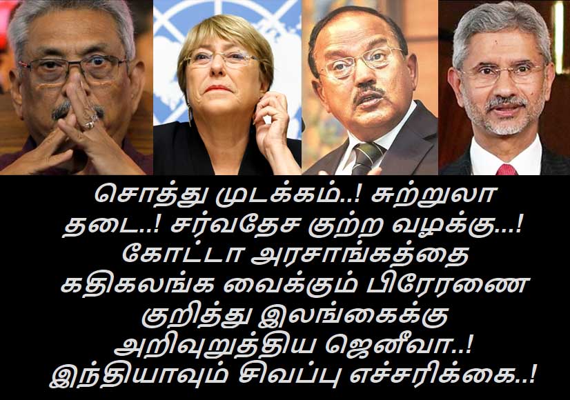 (லங்கா ஈ நியூஸ் - 2021, ஜனவரி 24, முற்பகல் 10.35) "மனித உரிமை மிறல் தொடர்பில் நம்பக்கூடிய குற்றம் சுமத்தப்பட்டுள்ள" இலங்கையின் சொத்துக்களை முடக்குவது மற்றும் சுற்றுலா முடக்கம் போன்ற தடைகளை விதிக்க வேண்டும் என ஐக்கிய நாடுகள் மனித உரிமைகள் ஆணையாளர் மிசேல் பெசலே அடுத்த மாதம் ஜெனீவாவில் ஆரம்பமாகவுள்ள மனித உரிமை கூட்டத் தொடரில் பிரேரணை முன்வைத்து உலக நாடுகளிடன் கோரிக்கை முன்வைக்கவுள்ளார்.