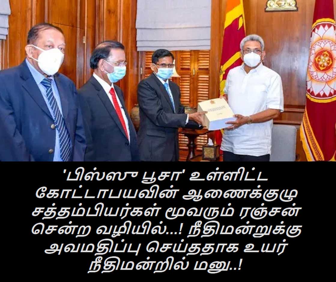 (லங்கா ஈ நியூஸ் - 2021, மார்ச் 01, பிற்பகல் 11.50) உபாலி அபேரத்ன என்ற பிஸ்ஸு பூசா, தயா சந்திரசிறி ஜயதிலக ஆகிய ஓய்வு பெற்ற ஊழல் மிகுந்த நீதிபதிகளும் சந்திரா பெனாண்டோ என்ற ஓய்வு பெற்ற ஊழல் நிறைந்த முன்னாள் பொலிஸ் மா அதிபர் ஆகிய ஜனாதிபதி விசாரணை ஆணைக்குழு சத்தம்பியர்கள் மூவரும் பாராளுமன்ற உறுப்பினர் ரஞ்சன் ராமாயக்கவுடன் சேர்ந்து சிறை சோறு உண்ணும் நிலை உருவாகி உள்ளது. அரசியல் பழிவாங்கல் தொடர்பில் விசாரணை செய்யும் ஜனாதிபதி ஆணைக்குழுவின் உறுப்பினர்களான இவர்கள் மூவரும் இணைந்து அண்மையில் வௌியிட்ட விசாரணை அறிக்கை பரிந்துரைகளில் உயர் நீதிமன்றுக்கு அபகீர்த்தி ஏற்படுத்தப்பட்டுள்ளதாக தெரிவித்து சட்டத்தரணிகள் நால்வர் இணைந்து உயர் நீதிமன்றில் மனு தாக்கல் செய்துள்ளனர்.