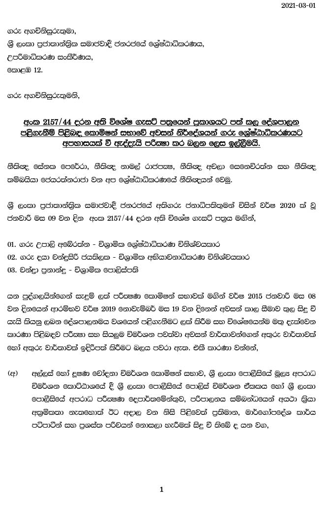 அரசியல் பழிவாங்கல் ஆணைக்குழு விசாரணையின் பரிந்துரைகளை செயற்படுத்துவது தொடர்பில் ஆராய மற்றுமொரு ஆணைக்குழு ஜனாதிபதியால் நியமிக்கப்பட்டுள்ளது. அதற்கு பிரியந்த ஜயரட்ன, ஹேமா குமுதினி விக்ரமசிங்க ஆகிய உயர் நீதிமன்ற நீதிபதிகள் இருவரும் ரத்னபிரிய குருசிங்க என்ற மேன்முறையீட்டு நீதிமன்ற நீதிபதியும் உள்ளடங்குவர். இதில் பிரியந்த ஜயவர்த்தன என்பவர் பசில் ராஜபக்ஷவின் சட்டத்தரணியாக செயற்பட்டதுடன் மஹிந்த ராஜபக்ஷ ஜனாதிபதியாக தெரிவு செய்யப்பட்ட பின் திடீரென மேல் உயர்த்தப்பட்டு உயர் நீதிமன்ற நீதிபதியாக நியமிக்கப்பட்ட முழு ராஜபக்ஷ ஆதரவாளர் ஆவார். அடுத்த உறுப்பினரான ஹேமா குமுதினி விக்ரமசிங்க சரத் நந்த சில்வா பிரதம நீதியரசராக கடமையாற்றிய போது அவரது விகாரை வேலைத் திட்டத்தில் நாடியாக இருந்த ஒருவர். அப்போது அவர் சட்டமா அதிபர் திணைக்கள சிரேஸ்ட சட்டத்தரணியாக இருந்தார். சரத் நந்த சில்வா அவரை மேலே உயர்த்தி மேல் நீதிமன்ற நீதிபதியாக நியமித்தார். அதன் பின்னர் சூழ்ச்சிகளை செய்து தன்னை விட சிரேஸ்ட நபர்கள் இருந்த போதும் அவர்களை பின் தள்ளி மேன்முறையீட்டு நீதிமன்ற நீதிபதியாக குமுதினி நியமனம் பெற்றார். சீல் ஆடை வழக்கில் லலித் வீரதுங்க உள்ளிட்ட நபர்களை விடுதலை செய்து விடுவித்தது குமுதினி விக்ரமசிங்க ஆகும். அதன் ஊடாக அவரது தரத்தை நாம் புரிந்து கொள்ள முடியும். ரத்னபிரிய குருசிங்க என்பவர் அண்மையில் ஜனாதிபதி கோட்டாபய ராஜபக்ஷவால் மேன்முறையீட்டு நீதிமன்றுக்கு நியமிக்கப்பட்ட 11 நீதிபதிகளுள் ஒருவர் ஆவார். அதில் 9 பேர் சிரேஸ்ட நிலை அடிப்படையில் நியமிக்கப்பட்டதுடன் அவர்கள் மேல் நீதிமன்ற நீதிபதிகளாக செயல்பட்டவர்கள். ஒருவர் பாராளுமன்றில் இருந்து உதவி செயலாளர் நாயகம் ஆவார். சட்டமா அதிபர் திணைக்களத்தில் இருந்து நியமிக்கப்பட்ட ஒருவர் ரத்னபிரிய குருசிங்க மாத்திரமே. அவர் ராஜபக்ஷ ஆதரவு சத்தம்பயராக இருந்த காரணத்தால் நியமனம் பெற்றுள்ளார். ஆனாலும் இந்த ஆணைக்குழு உறுப்பினர் நிலையில் இருந்து ரத்னபிரிய குருசிங்க தற்போது விலகியுள்ளார். அவருக்கு பதிலாக மேன்முறையீட்டு நீதிமன்றில் நீதிபதியாக கடமை புரியும் ஆர்.எம்.சோபித்த ராஜகருணா நியமிக்கப்பட்டுள்ளார்.