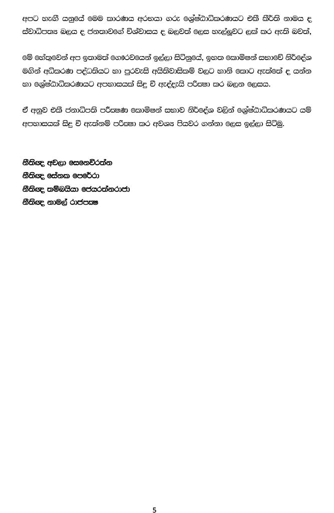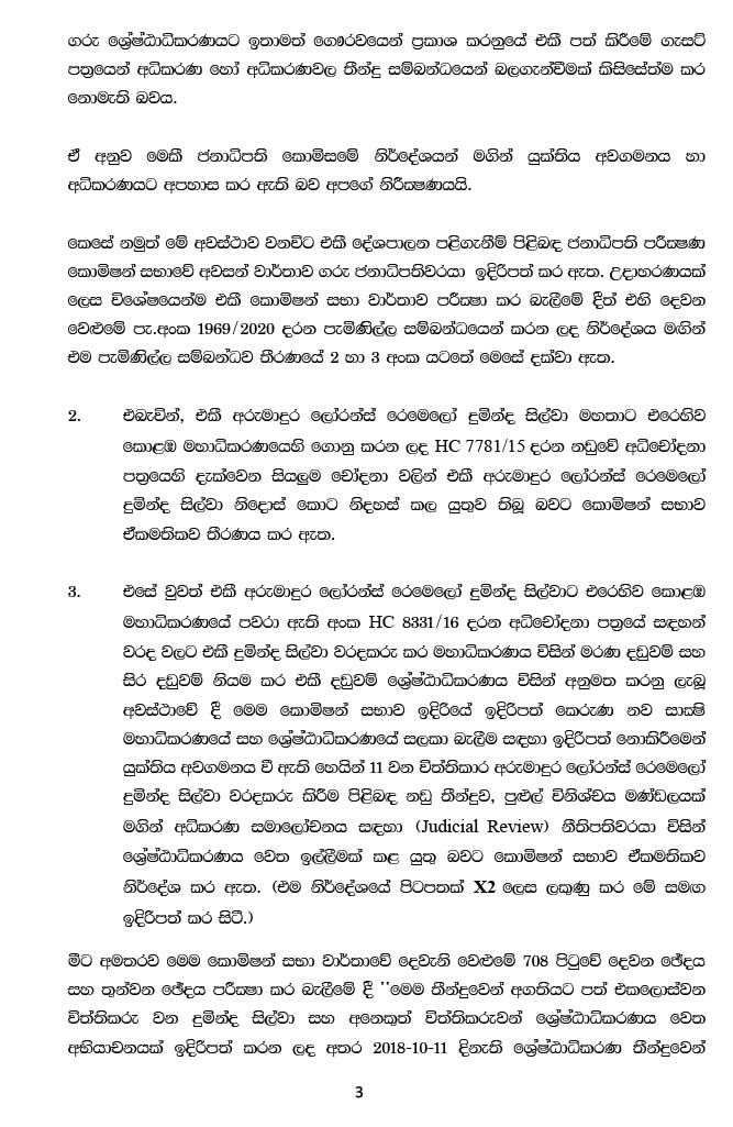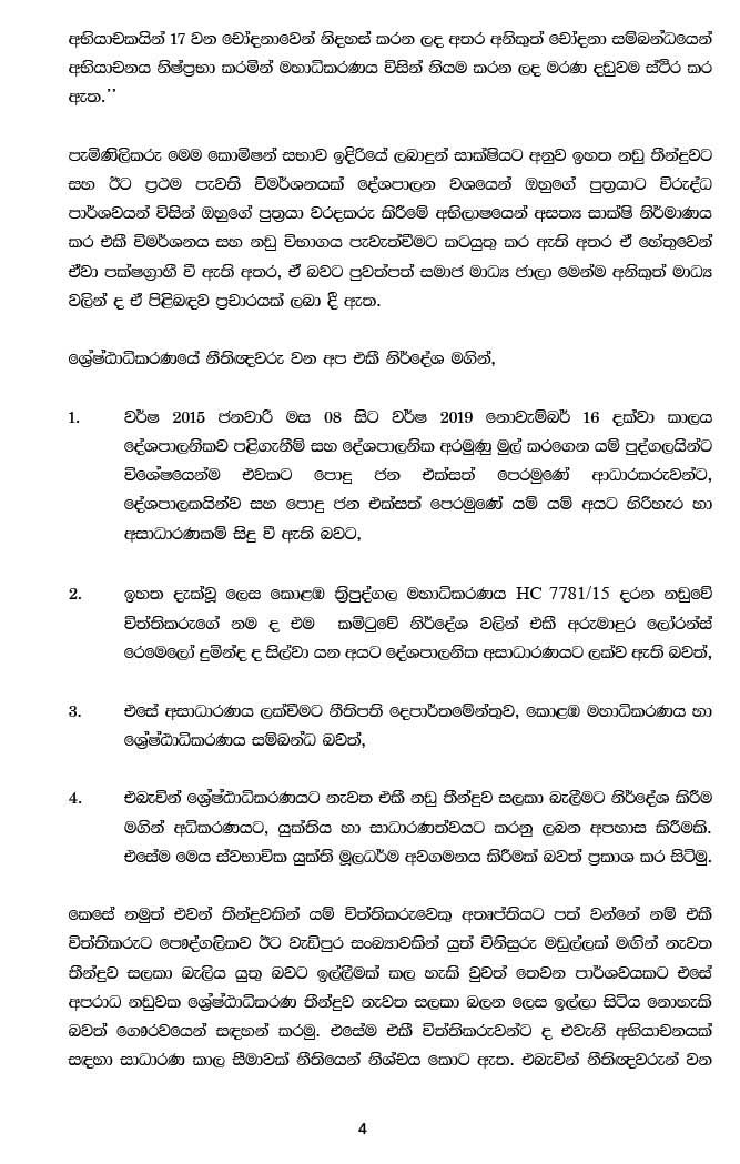 அதன்படி, உபாலி அபேரத்ன, சந்திரசிறி ஜயதிலக மற்றும் சந்திரா பெனாண்டோ ஆகியோர் அடங்கிய ஆணைக்குழு பரிந்துரையில் நீதிமன்றிற்கு அவமதிப்பு ஏற்பட்டுள்ளதாக உயர் நீதிமன்றம் தீர்ப்பு வழங்கினால் பாராளுமன்ற உறுப்பினர் ரஞ்சன் ராமநாயக்கவிற்கு வழங்கிய தண்டனையை இவர்களுக்கு வழங்காமல் இருக்க முடியாது. உயர் நீதிமன்றம் தனது நீதிமன்ற கௌரவத்தை காப்பாற்றிக் கொள்ளும் என பொது மக்கள் எதிர்பார்க்கின்றனர்.