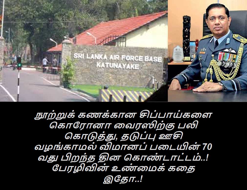 (லங்கா ஈ நியூஸ் - 2021 மார்ச் , 04 பிற்பகல் 01.55) இலங்கை விமானப் படையின் பிரதான முகாம் அமைந்துள்ள கட்டுநாயக்க விமானப் படை முகாமில் உள்ள விமானப் படை சிப்பாய்களுக்கு கொரோனா தடுப்பு ஊசி செலுத்தப்படவில்லை என்பதுடன் நாளாந்தம் அதிக கொரோனா வைரஸ் தொற்றாளர்கள் அடையாளம் காணப்படும் நிலையில் அது தொடர்பில் கவனத்தில் எடுக்காமல் விமானப் படையின் 70வது பிறந்த தினத்தை கொண்டாடவென சிப்பாய்களின் உயிரை பலி கொடுத்து செயற்பட்டு வருவதாக லங்கா ஈ நியூஸ் உள்ளக தகவல் சேவைக்கு செய்தி வந்துள்ளது.