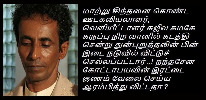 (லங்கா ஈ நியூஸ் - 2021 மார்ச் , 15 , பிற்பகல் 11.50) மாற்று சிந்தனை கொண்ட ஊடகவியலாளர் மற்றும் வௌியீட்டாளராக மற்றும் பதிப்பாளராக செயற்படும் சுமார் 35 வருடங்களுக்கு மேல் தொழில் அனுபவம் கொண்ட சுஜீவ கமகே என்பவர் கருத்து நிற வேனில் வந்த அடையாளம் தெரியாத நபர்களால் கடத்திச் செல்லப்பட்டு தாக்குதல் நடத்தி துன்புறுத்தப்பட்ட பின் இடை நடுவில் விட்டுச் சென்றுள்ளனர். பாதிக்கப்பட்ட சுஜீவ கமகே தற்போது கொழும்பு தேசிய வைத்தியசாலையின் அவசர விபத்து பிரிவில் அனுமதிக்கப்பட்டு சிகிச்சைப் பெற்று வருகிறார்.