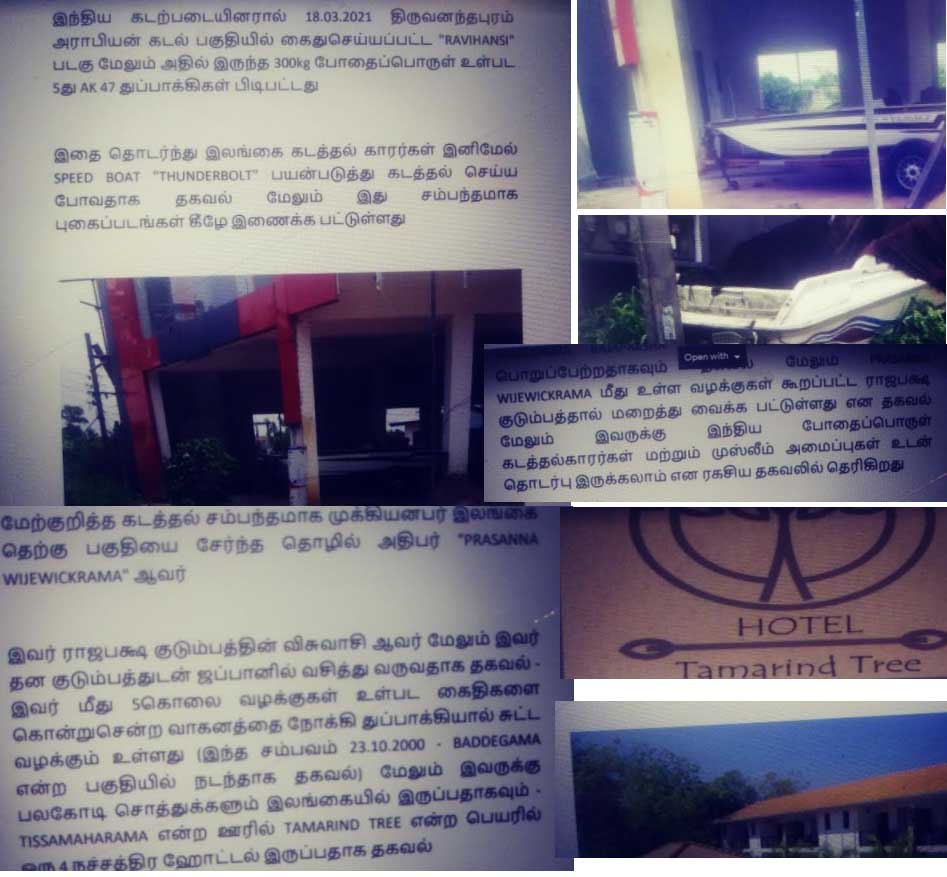 இந்த கடத்தல் கும்பல் தமது கடத்தல் நடவடிக்கைகளுக்கு பயன்படுத்தும் அதிவேக படகுகள் சிலவற்றின் புகைப்படங்களும் இங்கு இணைக்கப்பட்டுள்ளன. இந்த அதிவேக படகுகள் நிறுத்தி வைக்கப்பட்டிருக்கும் இடங்கள் கூட புகைப்படத்தில் வௌியிடப்பட்டுள்ளது. ஹைலெவல் வீதிக்கு அருகில் உள்ள இவருக்குச் சொந்தமான கட்டிடம் ஒன்று ஹெரோயின் போதைப் பொருள் கடத்தல் மத்திய நிலையமாக செயற்படுவதாக தகவல்கள் தெரிவிக்கின்றன. (அதனுடன் தொடர்புடைய புகைப்படம் இங்கு இணைக்கப்பட்டுள்ளது)