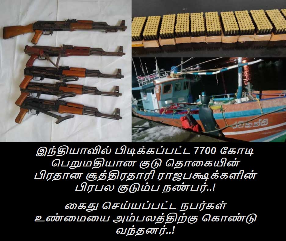 (லங்கா ஈ நியூஸ் - 2021 , ஏப்ரல் , 17. பிற்பகல் 09.50) தென் இந்திய பாதுகாப்பு பிரிவினர் கடந்த மார்ச் மாதம் 25 ஆம் திகதி மேற்கொண்ட விசேட தேடுதல் நடவடிக்கையின் போது 200 கிலோ கிராம் ஹெரோயின் போதைப் பொருள், 60 கிலோ கிராம் ஹசீஸ் போதைப் பொருள், AK 47 ரக கைத் துப்பாக்கிகள் ஐந்து, 1000 துப்பாக்கி ரவைகள் மற்றும் தடை செய்யப்பட்ட தொழிநுட்ப உபகரணங்கள் பலவும் மீட்கப்பட்டதுடன் இந்த போதைப் பொருட்கள் மற்றும் ஆயுதங்களை கடத்திச் சென்ற மூன்று இலங்கை மீன்பிடி படகுகளுடன் அதில் பயணித்த 19 பேரை சந்தேகத்தின் பேரில் கைது செய்தனர்.