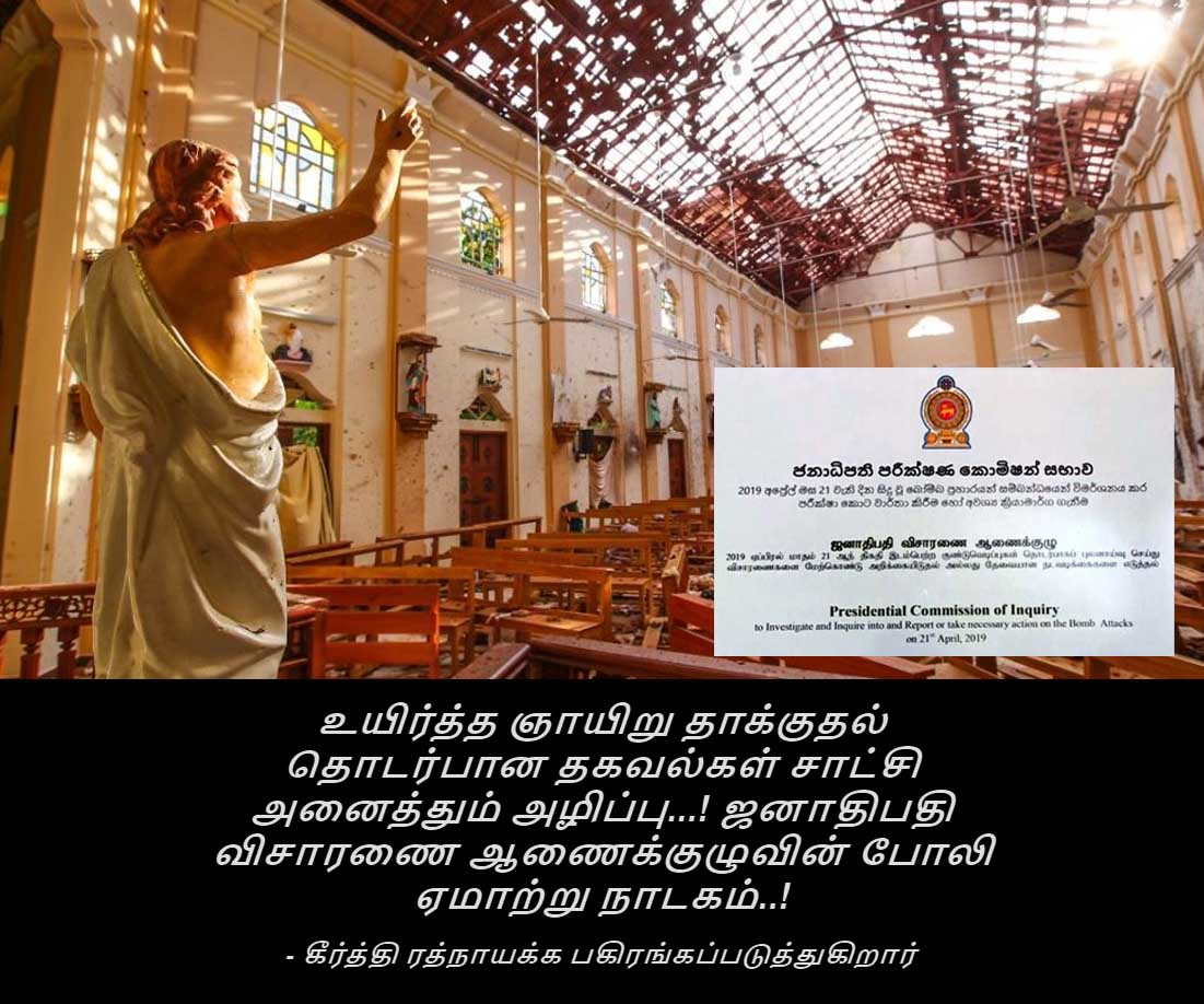 உயிர்த்த ஞாயிறு தாக்குதல் தொடர்பான ஜனாதிபதி விசாரணை ஆணைக்குழுவின் அறிக்கை தற்போது சட்ட மா அதிபர் திணைக்களத்திடம் சமர்பிக்கப்பட்டுள்ளது. வழக்கு தாக்கல் செய்யப் போவது யாருக்கு? முற்று முழுதாக விடுதலை செய்யப் போவது யாரை? என்பது தொடர்பில் சட்ட மா அதிபர் திணைக்களம் ஆராய்ந்து வருகிறது. நேற்று முன்தினம் பாராளுமன்றில் ஞாயிறு தாக்குதல் குறித்து உரையாற்றிய ஐக்கிய மக்கள் சக்தி பாராளுமன்ற உறுப்பினர் மனுஷ நாணயக்கார, ஞாயிறு தாக்குதல் விசாரணை அறிக்கை தொடர்பில் ஆராய சட்ட மா அதிபர் திணைக்களத்திற்கு இராணுவ புலனாய்வு பிரவு பிரதானி செல்வது குறித்து கேள்வி எழுப்பி இருந்தார். ஜனாதிபதி கோட்டாபய ராஜபக்ஷவின் பிரபல புலனாய்வு பிரிவு பிரதானி சுரேஸ் சாலி சட்ட மா அதிபர் திணைக்களத்திற்கு செல்வது கோட்டாபய ஒப்படைத்துள்ள காரியத்தை சரிவர நிறைவேற்றுவதற்கு அல்லவா..? அப்படியானால் உயிர்த்த ஞாயிறு தாக்குதலின் உண்மைகளை மறைப்பதாகத் தானே அர்த்தம்? அதனால் விசாரணை செய்ய வேண்டியது சுரேஸ் சாலியை அன்றி சுயாதீன நீதி கட்டமைப்பின் அடிப்படை மூலதர்ம கோட்பாட்டை மீறி சந்தேநபர்களை வழக்கு விசாரணை செய்யும் செயலுக்கு நியமித்த கோட்டாபயவைத் தானே? விசாரணை நடத்த வேண்டியது இலங்கை அரசியலில் மிகவும் இழிவான ஜனாதிபதி தேர்தல் பிரச்சாரத்தை முன்னெடுத்துச் சென்று சாக்கு விளையாட்டுக் காட்டிய நபரை அல்லவா.?
