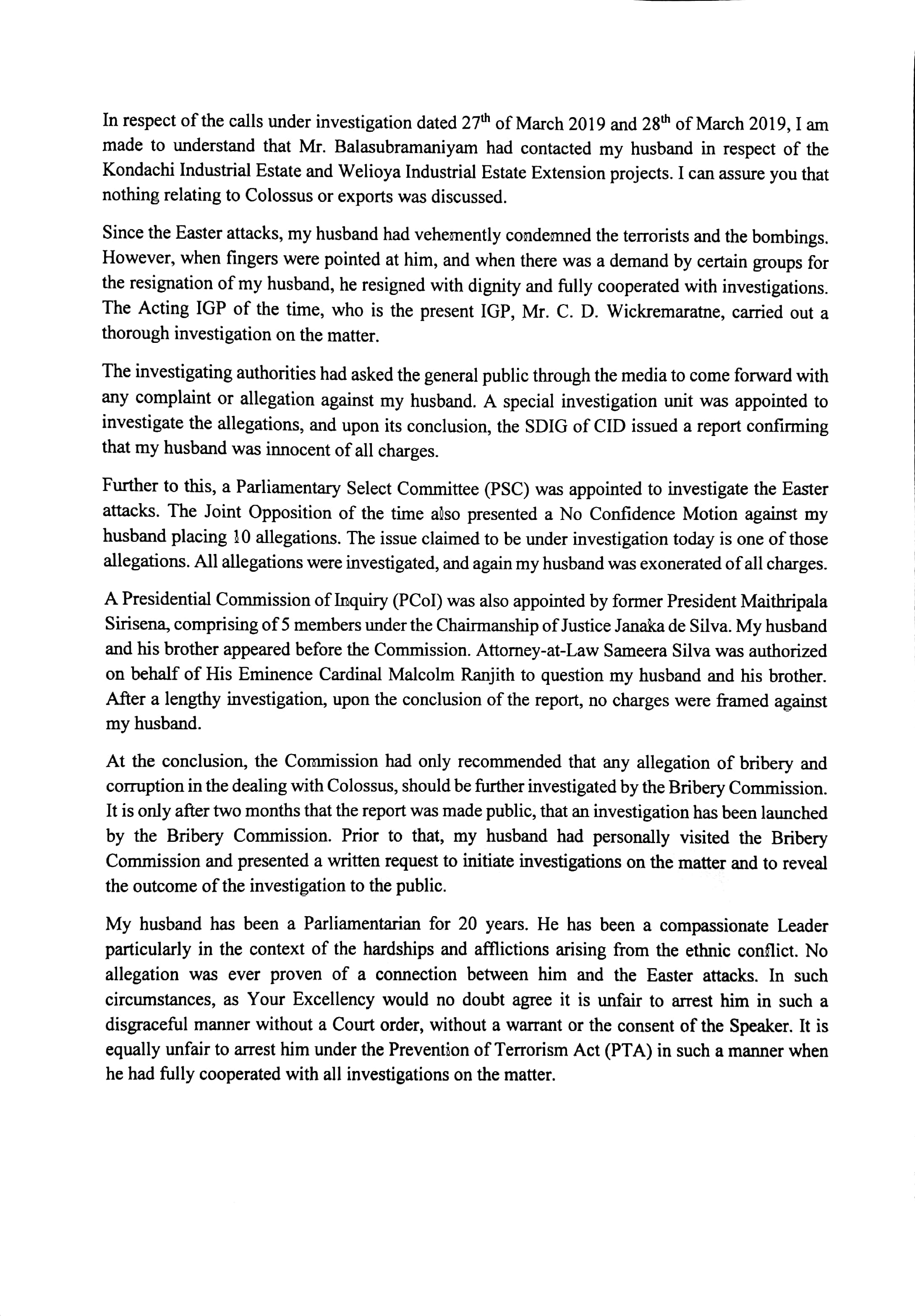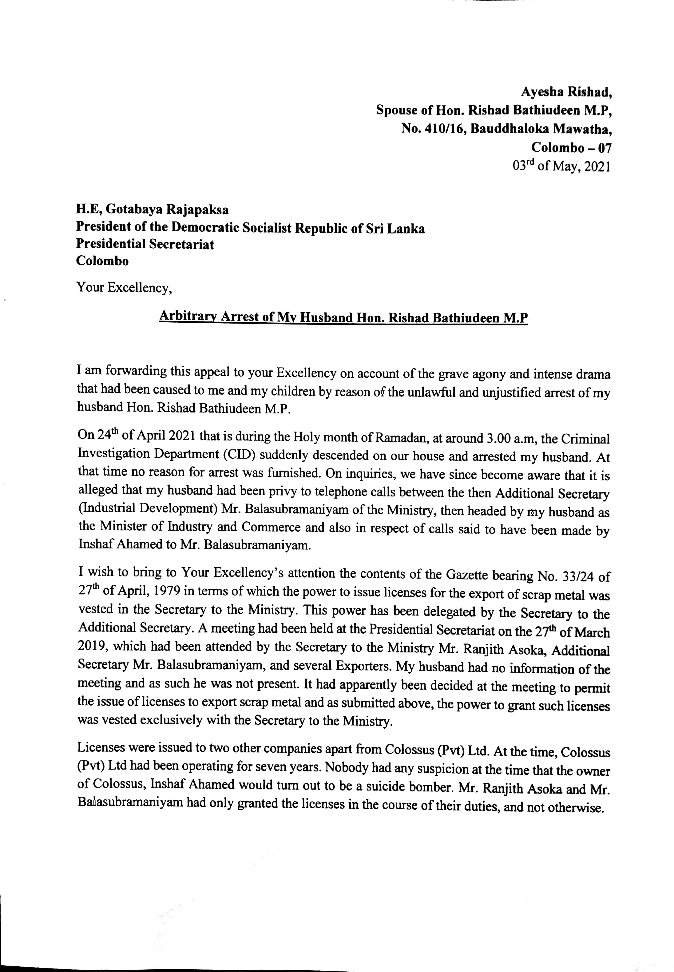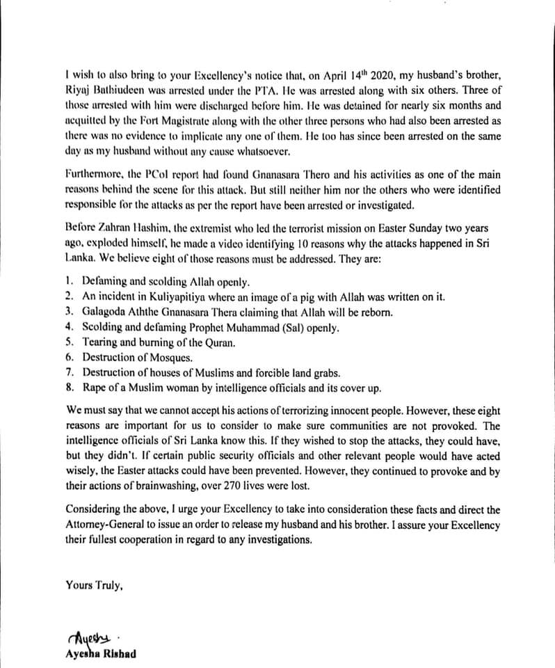 பாராளுமன்ற உறுப்பினர் ரிசாத் பதியூதினின் மனைவி அயேசா ரிசாத் ஜனாதிபதிக்கு அனுப்பி வைத்துள்ள கடிதத்தில் வடிவம் இங்கு தரப்பட்டுள்ளது.