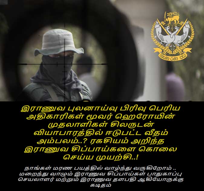 இந்த கடிதத்தை எழுதும் நாம் அண்மைக் காலமாக இராணுவ புலனாய்வு பிரிவின் போதைப் பொருள் சுற்றிவளைப்பு பணியில் ஈடுபட்டு வந்த சிப்பாய்கள் சிலராவோம்.