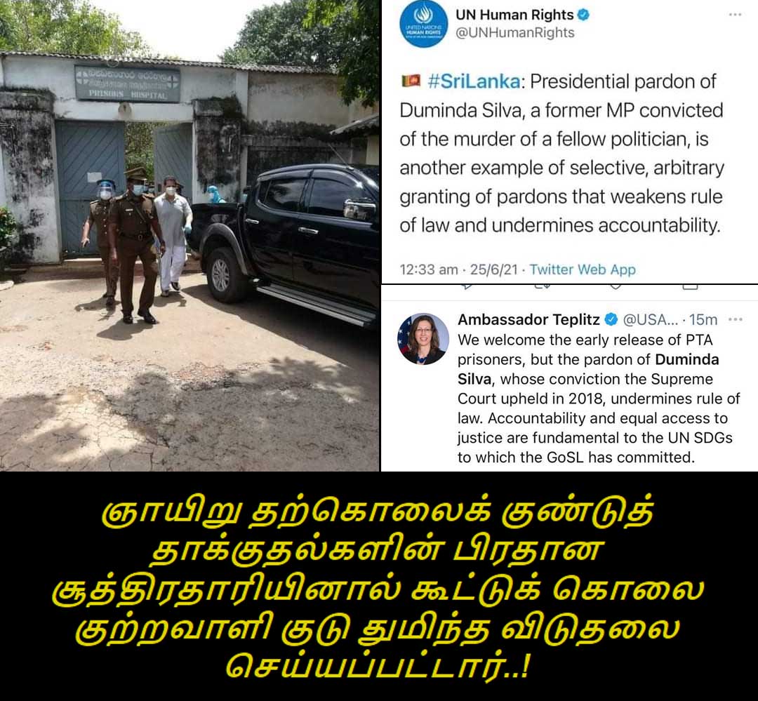 ( லங்கா ஈ நியூஸ் - 2021 , ஜூன் , 24 பிற்பகல் 11.34 ) ஞாயிறு தற்கொலை குண்டுத் தாக்குதல் தொடர்பில் தற்போது பிரதான சூத்திரமாரி என விலர் நீட்டி குற்றம் சுமத்தப்படும் ஜனாதிபதி கோட்டாபய ராஜபக்ஷ தனது ஜனாதிபதி பதவியை துஸ்பிரயோகம் செய்து முன்னாள் ஜனாதிபதியின் ஆலோசகராக இருந்த பாரத லக்ஷமன் பிரேமசந்திர உள்ளிட்ட நால்வரை நடு வீதியில் கொலை செய்த சம்பவத்தில் கூட்டுக் கொலையாளி என மூன்று நீதிமன்றங்களும் உறுதி செய்து மரண தண்டனை விதித்த அருமாதுர ரொமெலோ துமிந்த சில்வா என்ற 'குடு துமிந்த' வை புனித பொசன் போயா தினத்தில் 24 ஆம் திகதி ஜனாதிபதி பொது மன்னிப்பின் கீழ் விடுதலை செய்து வீட்டுக்கு அனுப்பி உள்ளார்.