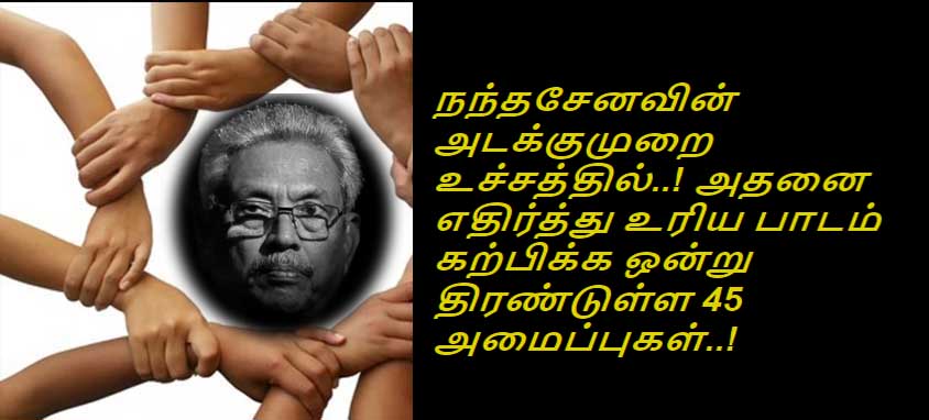 (லங்கா ஈ நியூஸ் - 2021, ஜூலை 10, பிற்பகல் 2.30) இலங்கையில் தொடர்ந்து தோல்வியான ஆட்சியை புரிந்து வரும் கோட்டாபய ராஜபக்ஷ அரசாங்கம் மக்கள் மீதும் சிவில் அமைப்புக்கள் மீதும் தொழிற்சங்கங்கள் மீதும் கட்டவிழ்த்துவிட்டுள்ள ஜனநாயக விரோத அடக்குறைக்கு எதிராக சுமார் 45 சிவில் அமைப்புகள் ஒன்றுதிரண்டுள்ளன. கோட்டாபய ராஜபக்ஷவின் ஆட்சியை முடிவுக்கு கொண்டுவரும் நோக்கமாக சிவில் அமைப்புகள், தொழிற்சங்கங்கள், ஊடக நிறுவனங்கள் என 45 அமைப்புகள் ஒன்று சேர்ந்துள்ளன. குறித்த அமைப்புகள் இணைந்து வௌியிட்டுள்ள கூட்டு ஊடக அறிக்கையின் முழு வடிவம் கீழ்வருமாறு,
