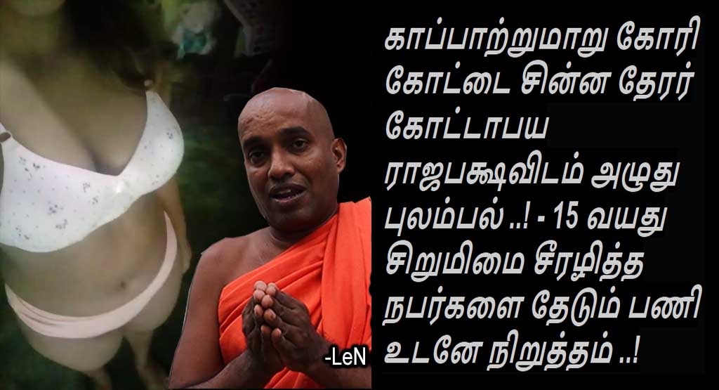 களனி ஈரிவெட்டி லும்பினி விகாரையின் விகாராதிபதி 50 வயதுடைய கேகாலை பஞ்சா விக்ருத்த தேரரை போன்று சிறுமியை வல்லுறவு செய்த இலங்கை கடற் படை விசேட வைத்திய நிபுணர் திமுத் டி சில்வா கைது செய்யப்பட்டு அவரிடம் இருந்து தகவல்கள் பெறப்பட்டுள்ள நிலையில் கோட்டை சின்ன தேரர் ஜனாதிபதி கோட்டாபய ராஜபகக்ஷவிற்கு தொலைபேசி மூலம் அழைப்பெடுத்து தன்னை காப்பாற்றுமாறு அழுது புலம்பியதுடன் இதனால் மேலும் தேரர்கள் கைது செய்யப்பட்டு பௌத்த சாசனத்திற்கு வீழ்ச்சி ஏற்படும் எனவும் கூறியுள்ளார்.